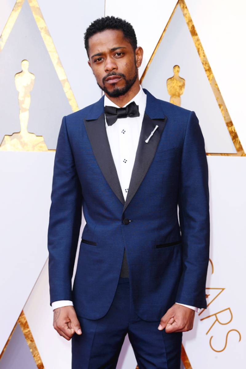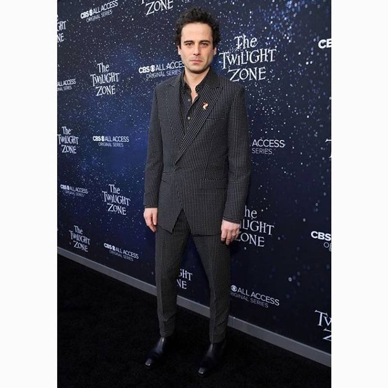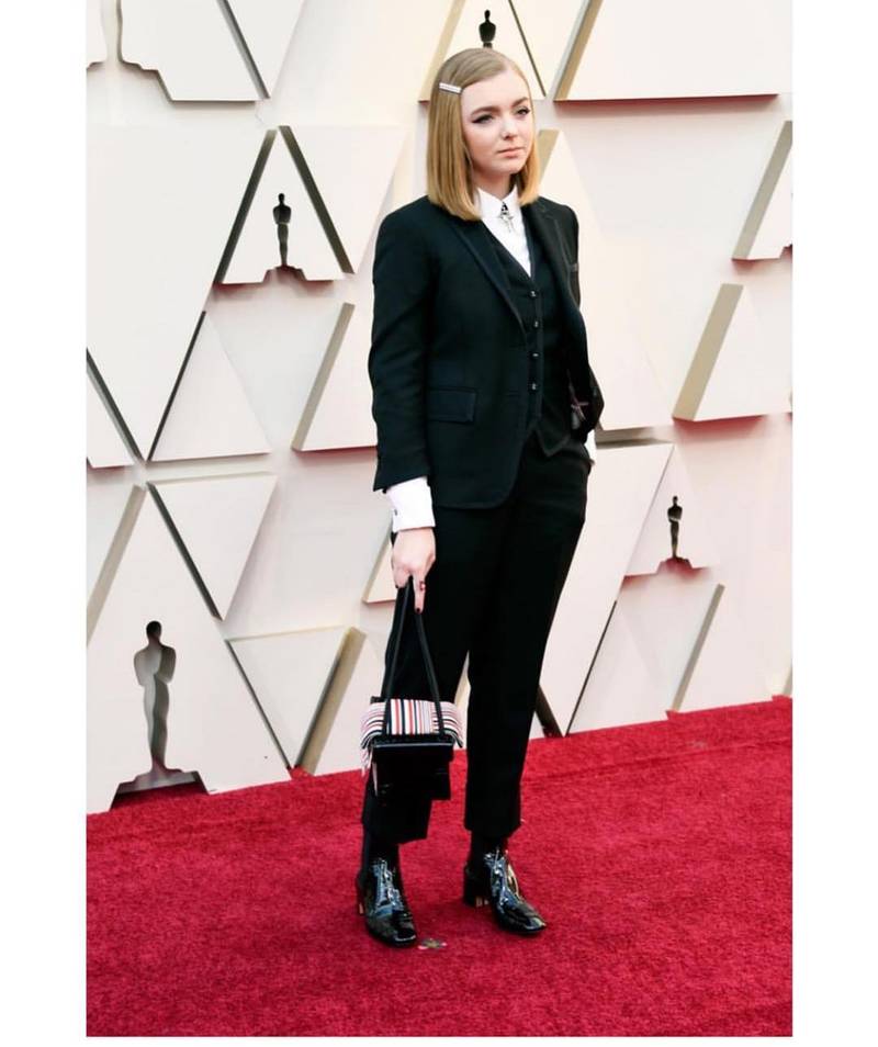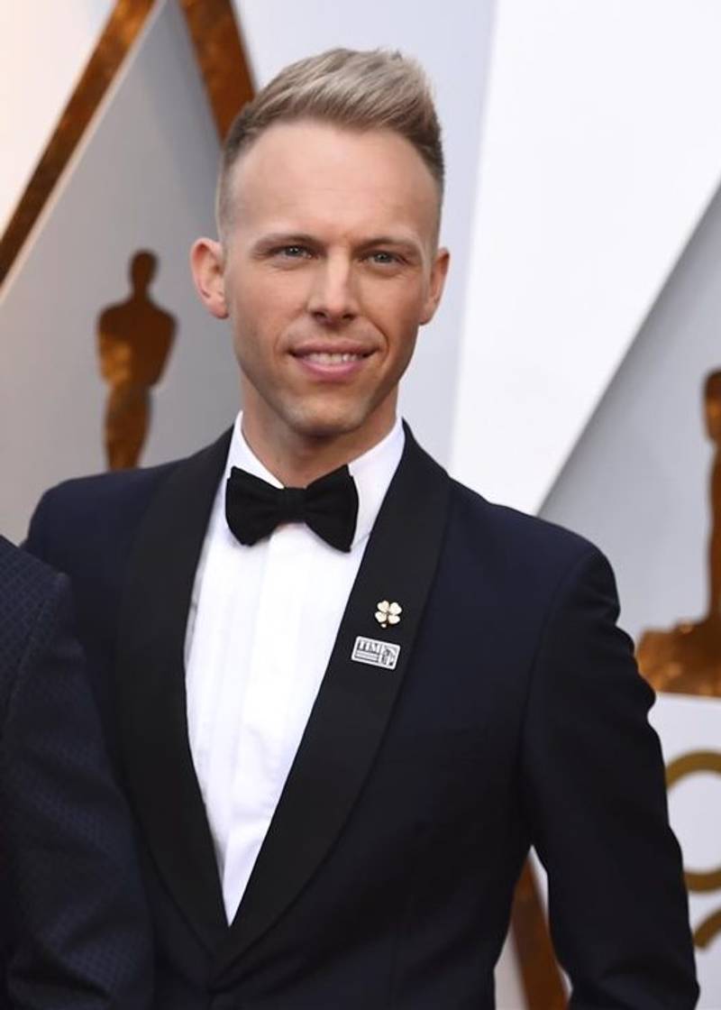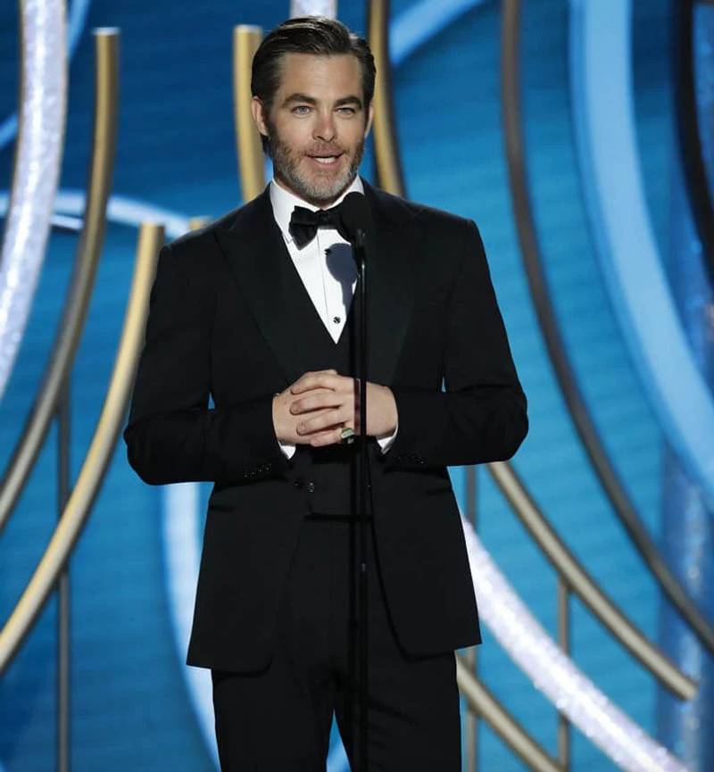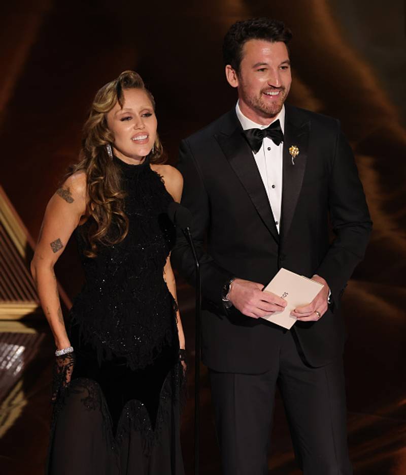 Miles Teller, present of the award for Best Sound, wore a diamond flower brooch in 18k gold with vintage Black Starr & Frost onyx and diamond dress set in platinum.