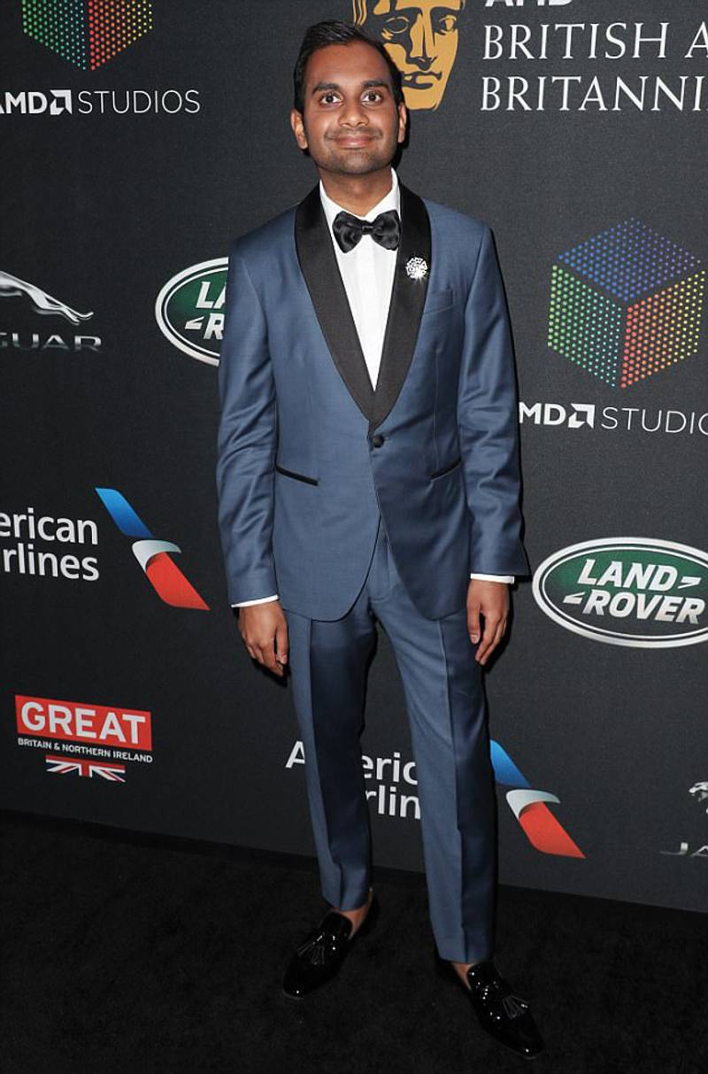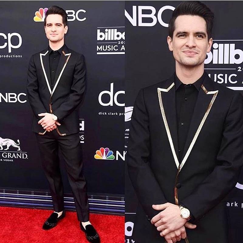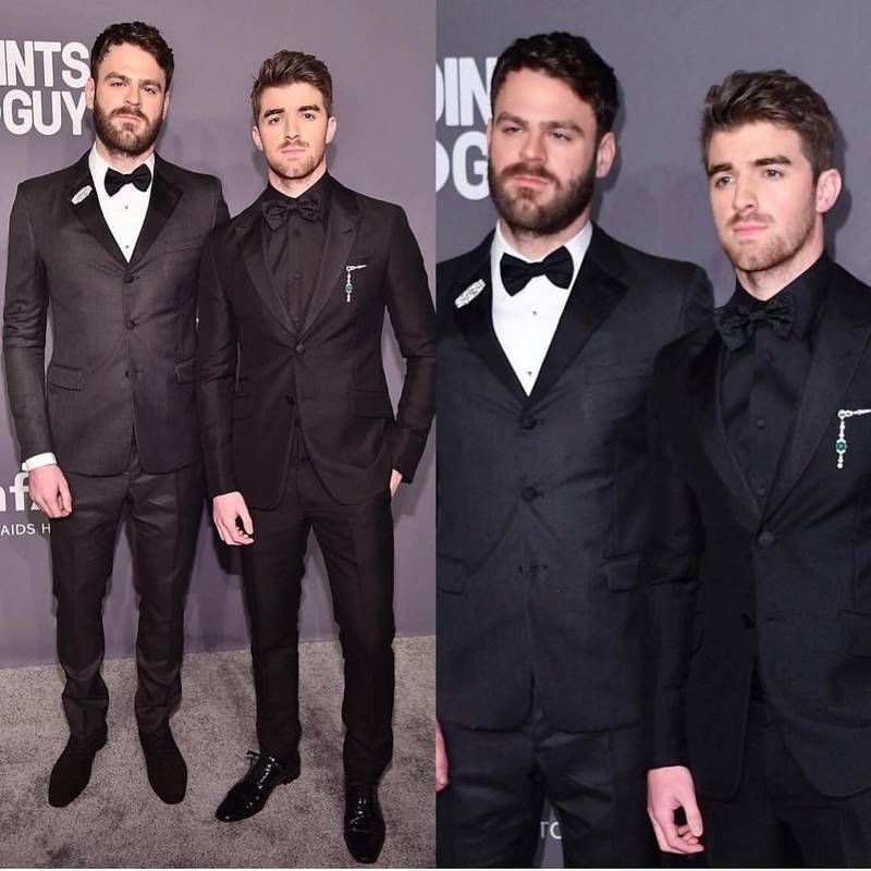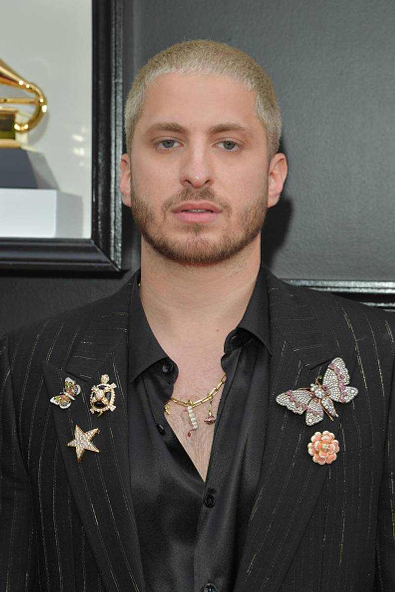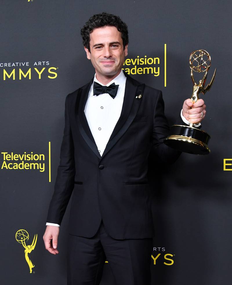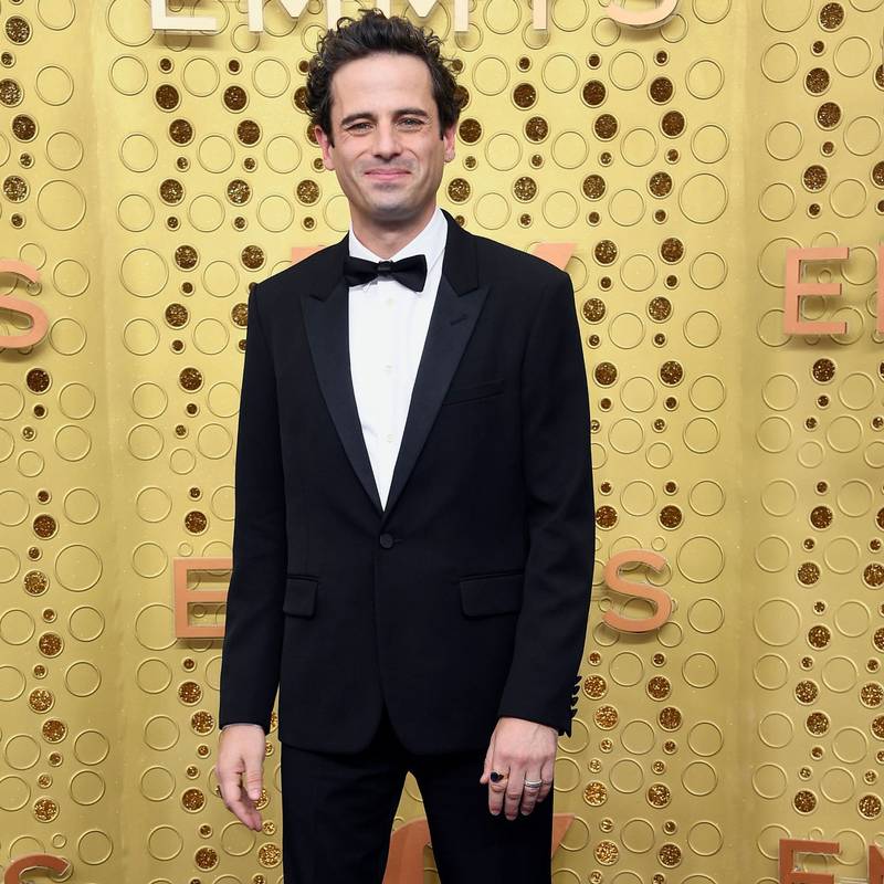 Miles Teller, present of the award for Best Sound, wore a diamond flower brooch in 18k gold with vintage Black Starr & Frost onyx and diamond dress set in platinum.