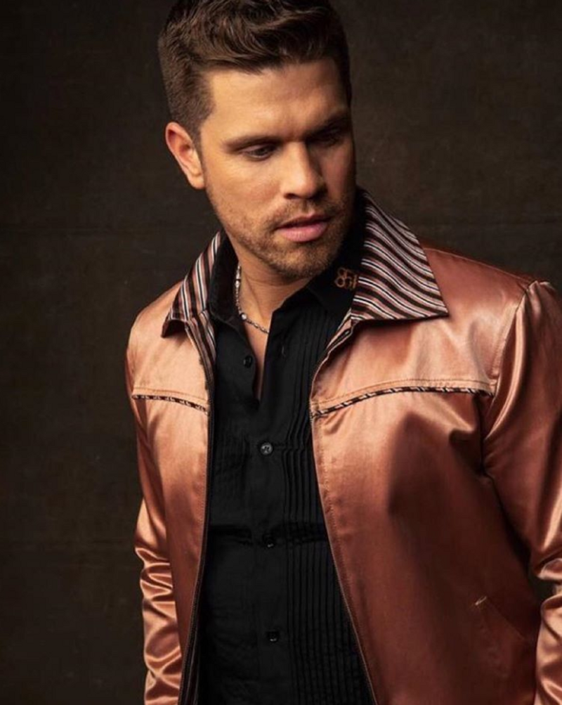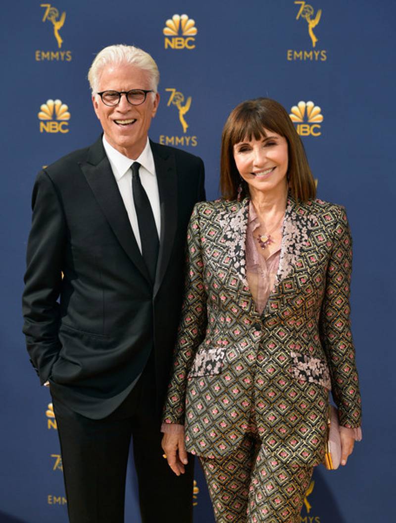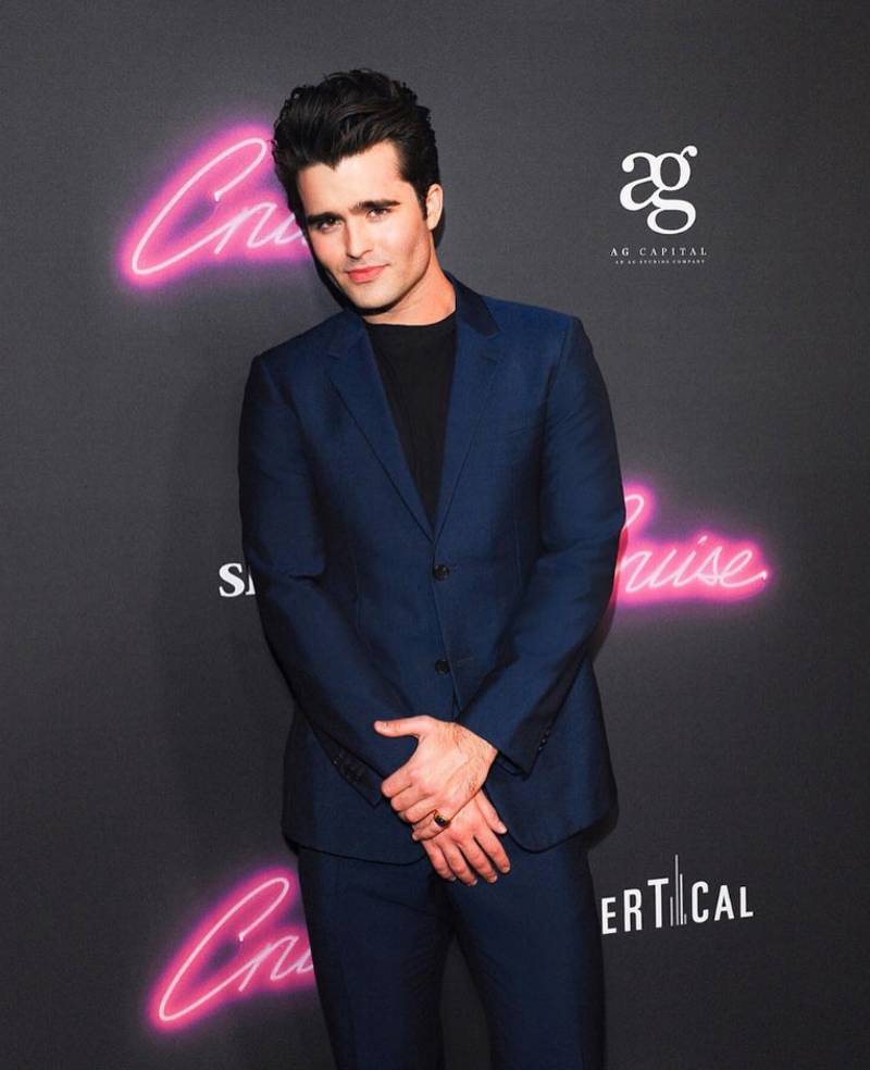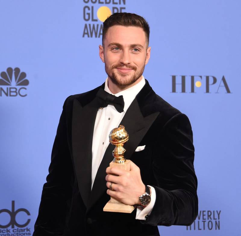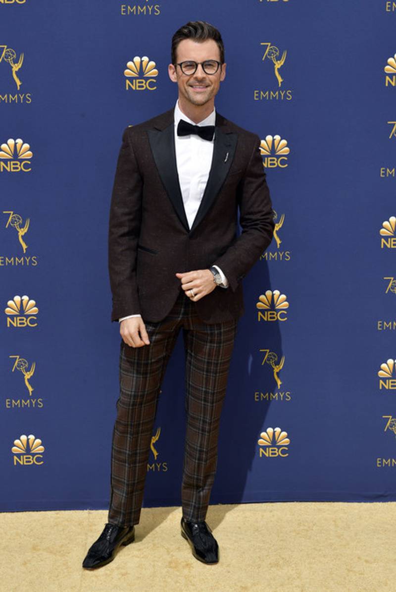 Miles Teller, present of the award for Best Sound, wore a diamond flower brooch in 18k gold with vintage Black Starr & Frost onyx and diamond dress set in platinum.