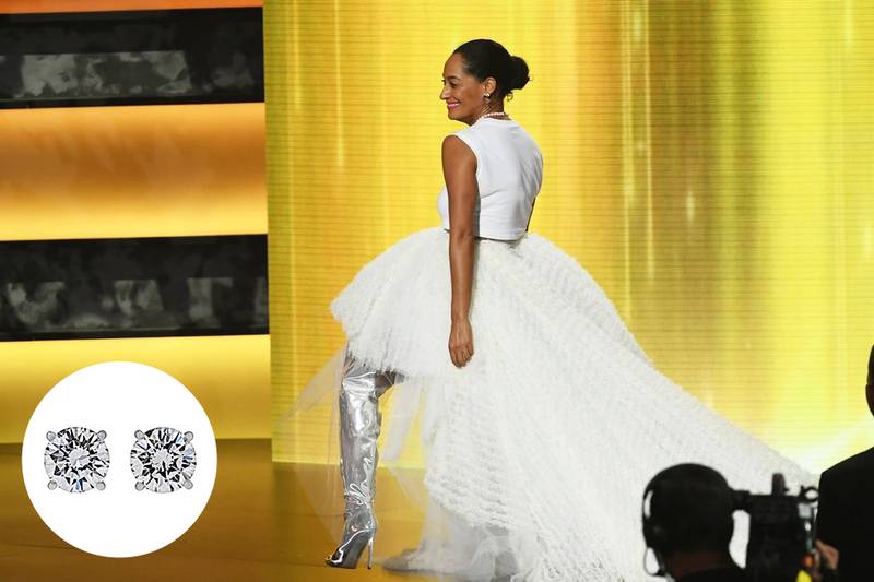 Melissa McCarthy wears diamond door knocker earrings, from Beladora, for the 82nd Golden Globe Awards.
