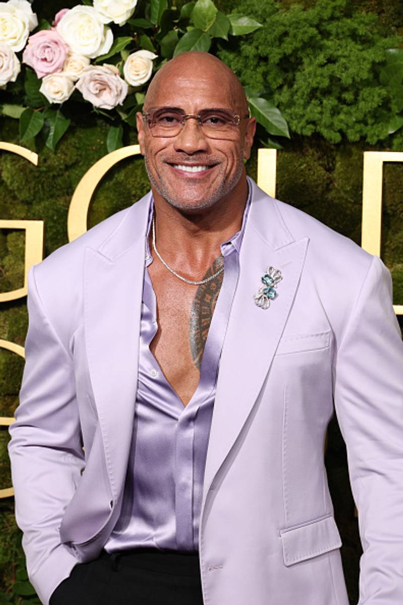 Dwayne Johnson wears a Retro aquamarine double clip brooch, from Beladora, for the 82nd Golden Globe Awards.