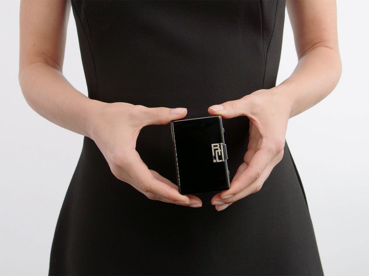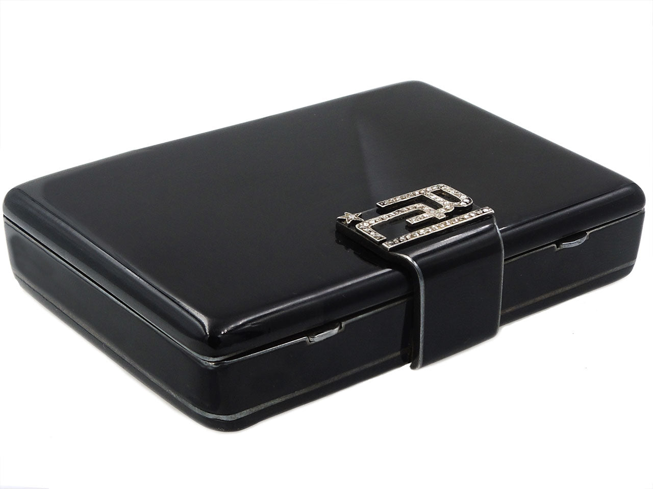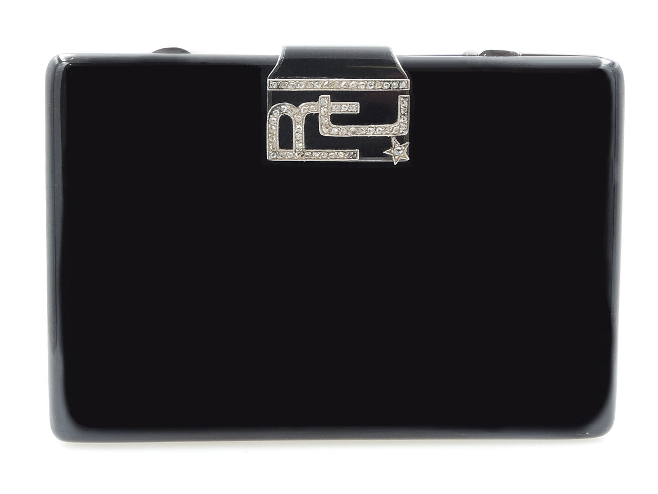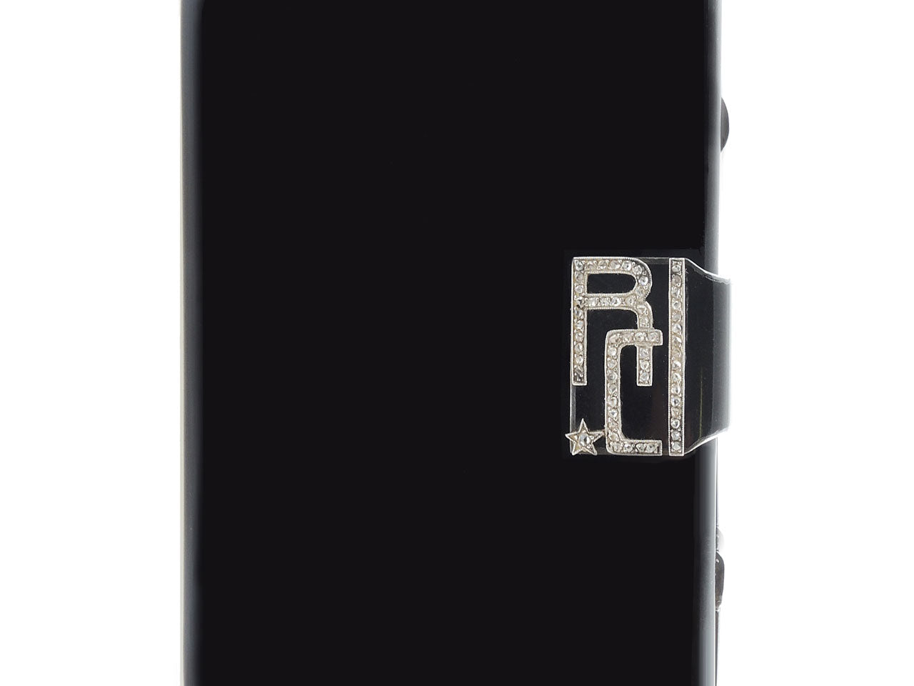 Of rectangular outline with rounded corners, black enamel exterior, diamond-set sliding thumbpiece monogrammed R.C., opening to reveal a mirror, lipstick holder and two compartments, in silver. Signed Cartier. Weight including mirror. Minor wear marks.