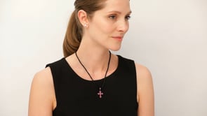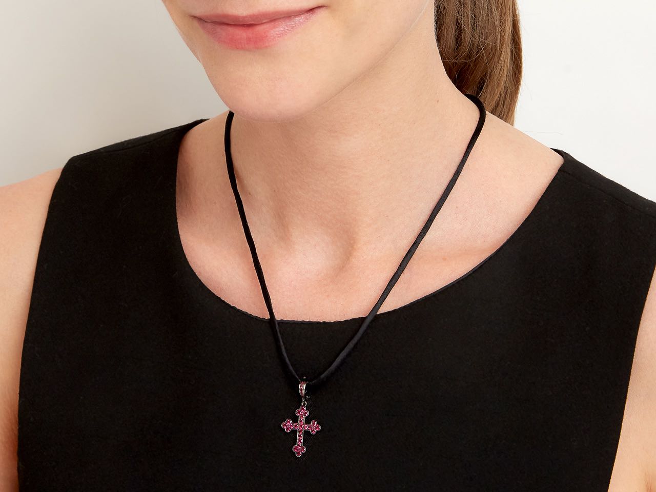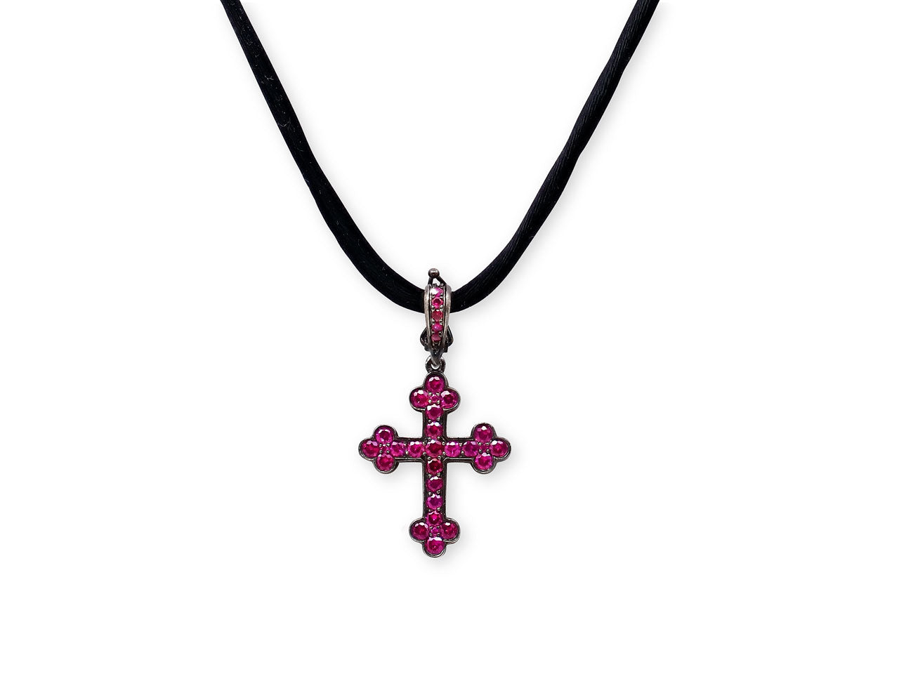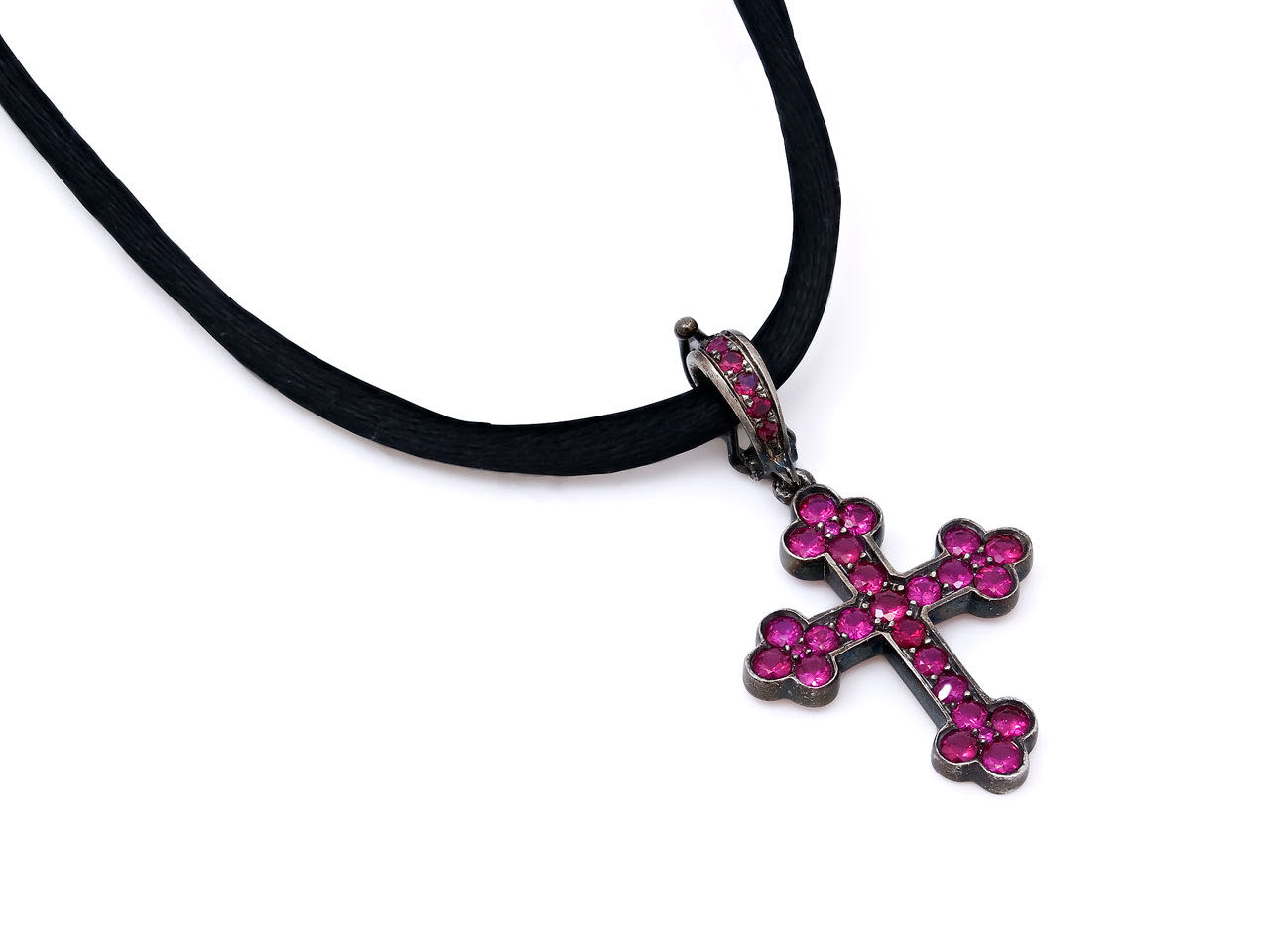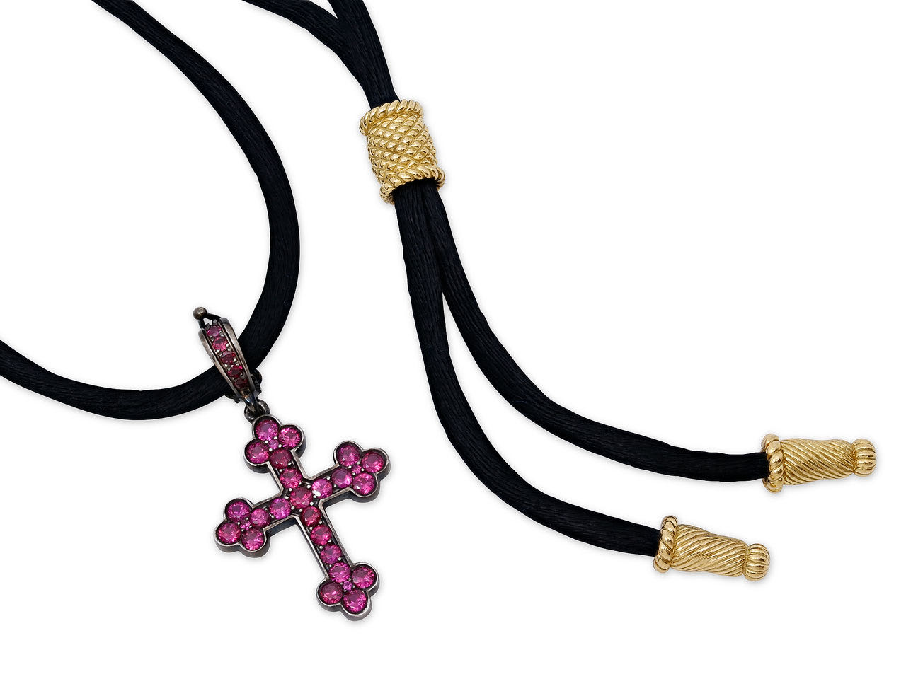 The budded cross set with rubies, from a hinged ruby set bail, in blackened platinum, suspended from an adjustable silk cord with 18k gold terminals.