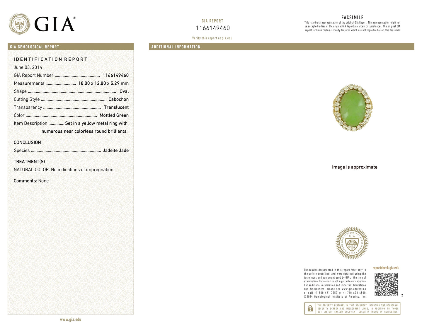 - Gem Stone: Jadeite 18.00 x 12.80 x 5.29 mm; GIA 1166149460