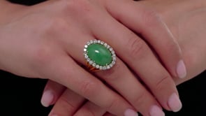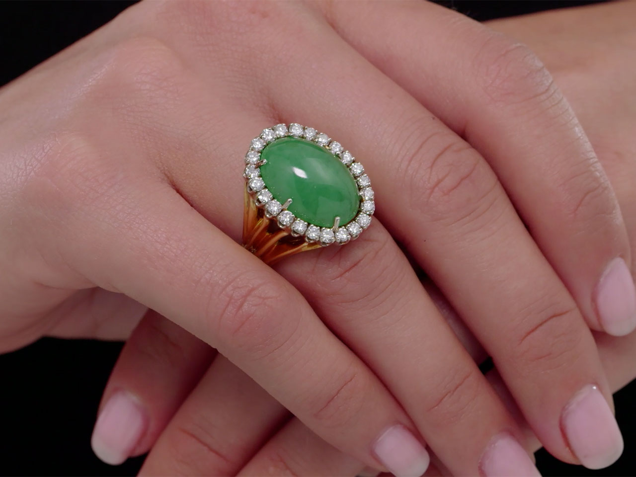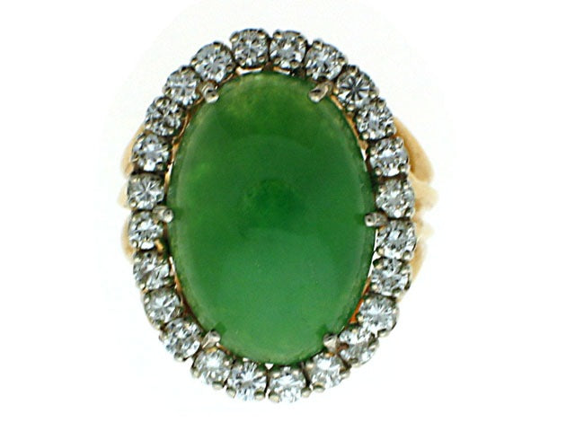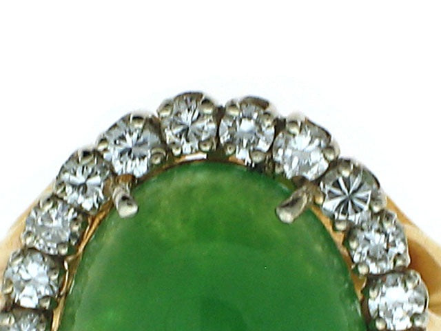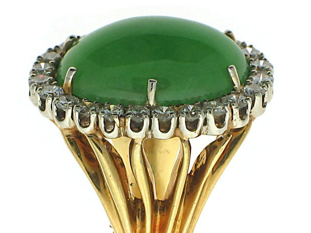This vintage ring is designed with beautiful oval green jadeite cabochon bordered by prong set round diamonds in white gold on a unique mounting of bands of yellow gold that form the shank.