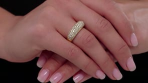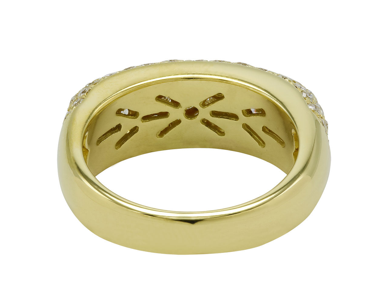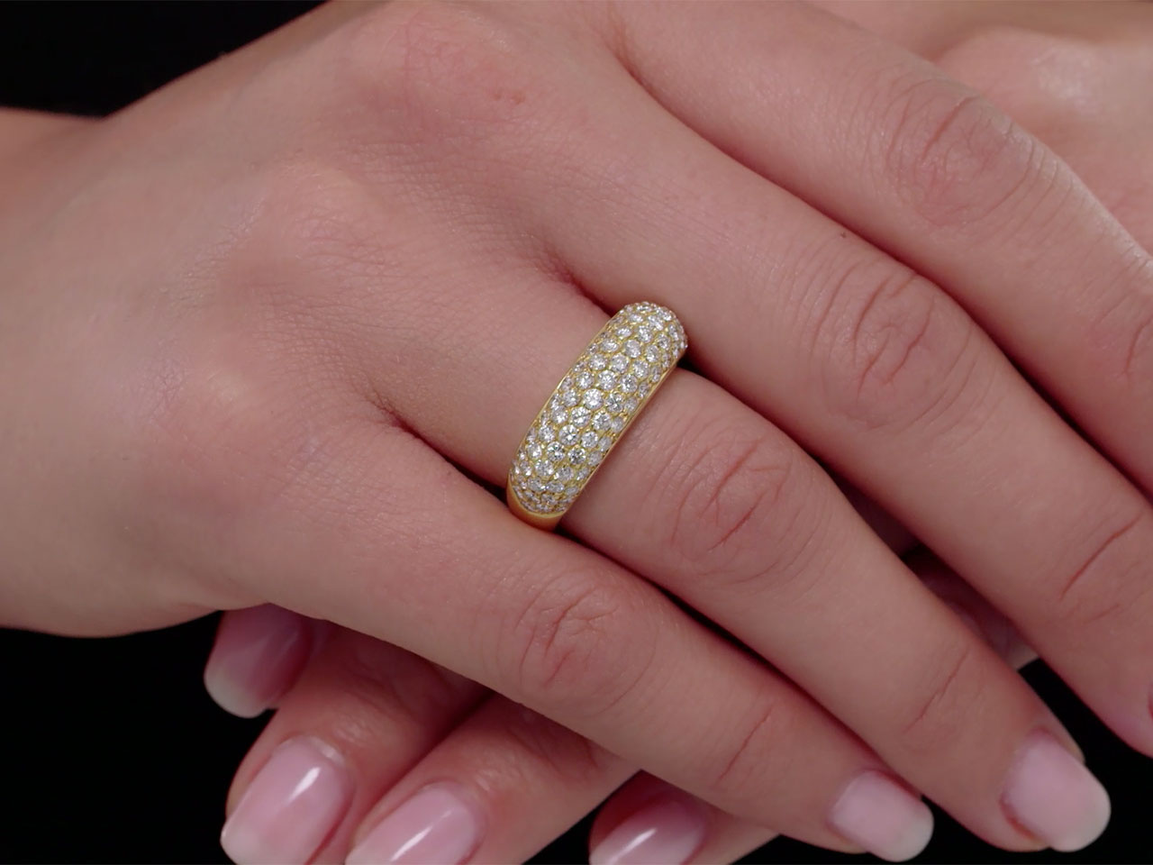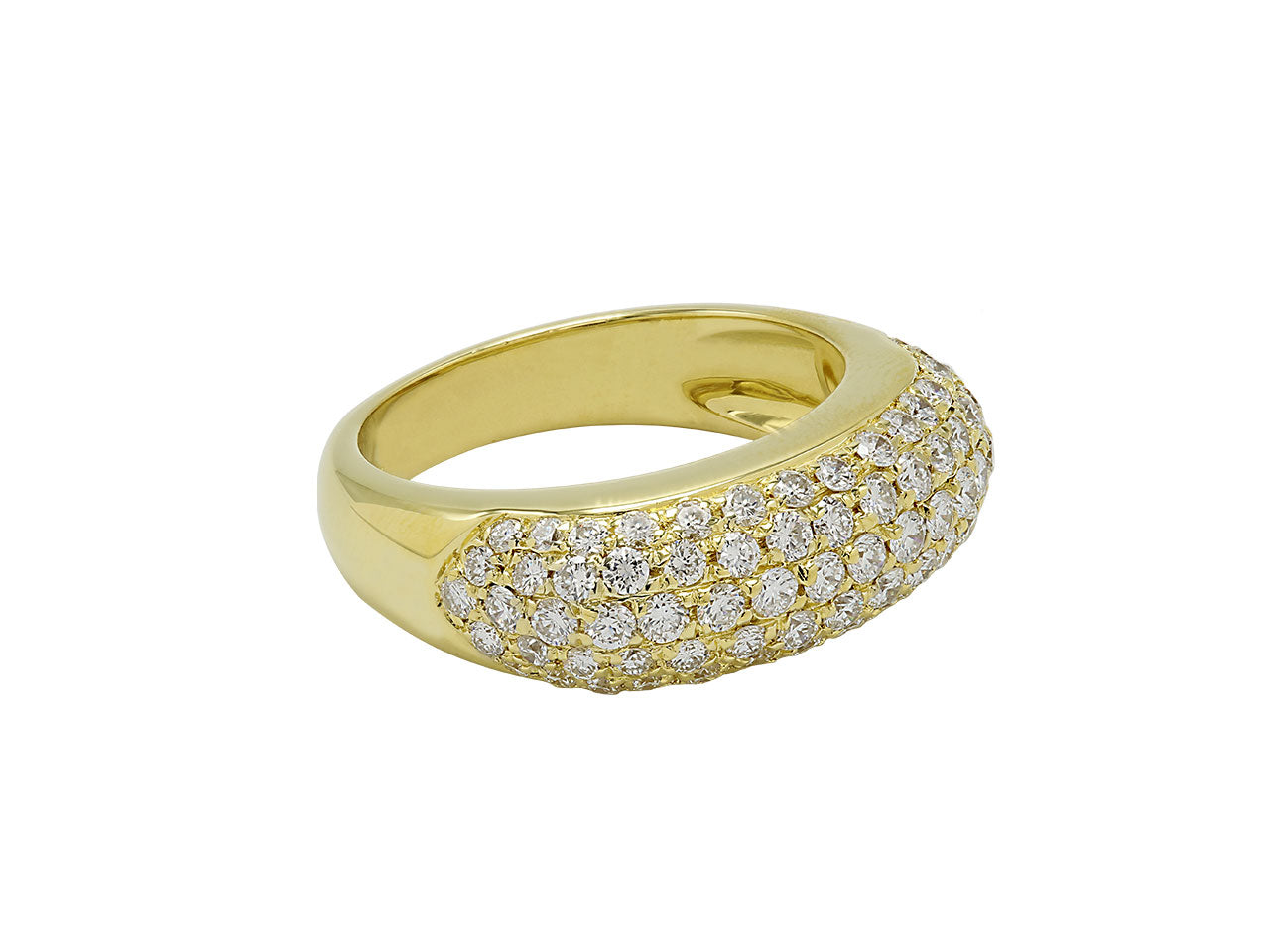 The diamond dome with angled edges, pavé-set with five graduated rows of round diamonds, above a polished 18k gold base.