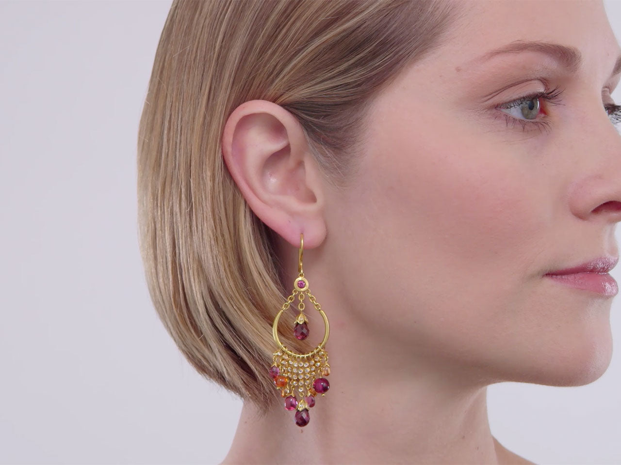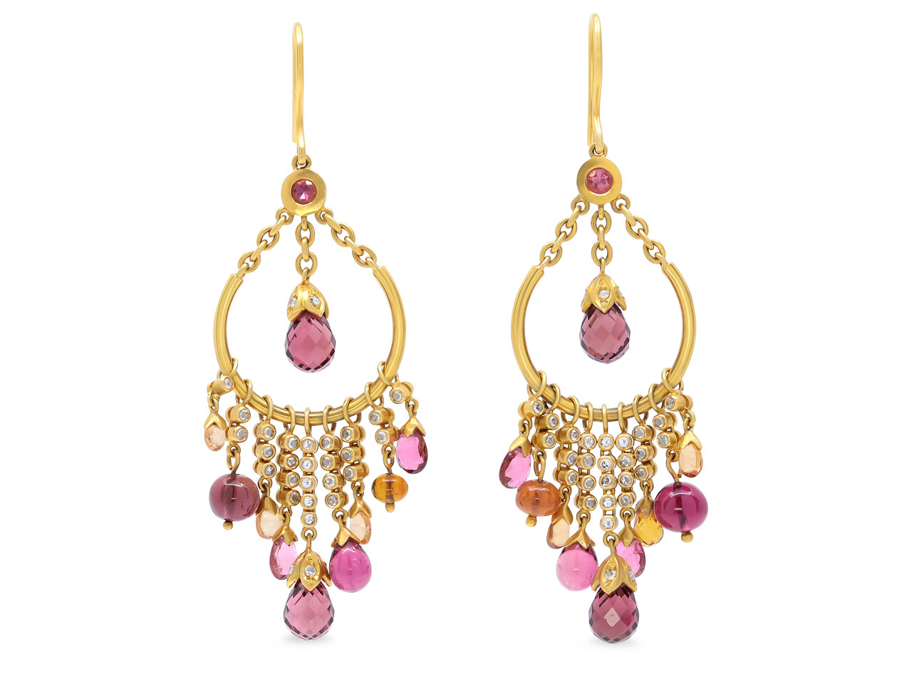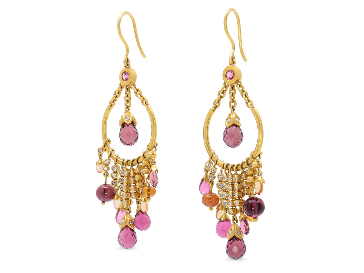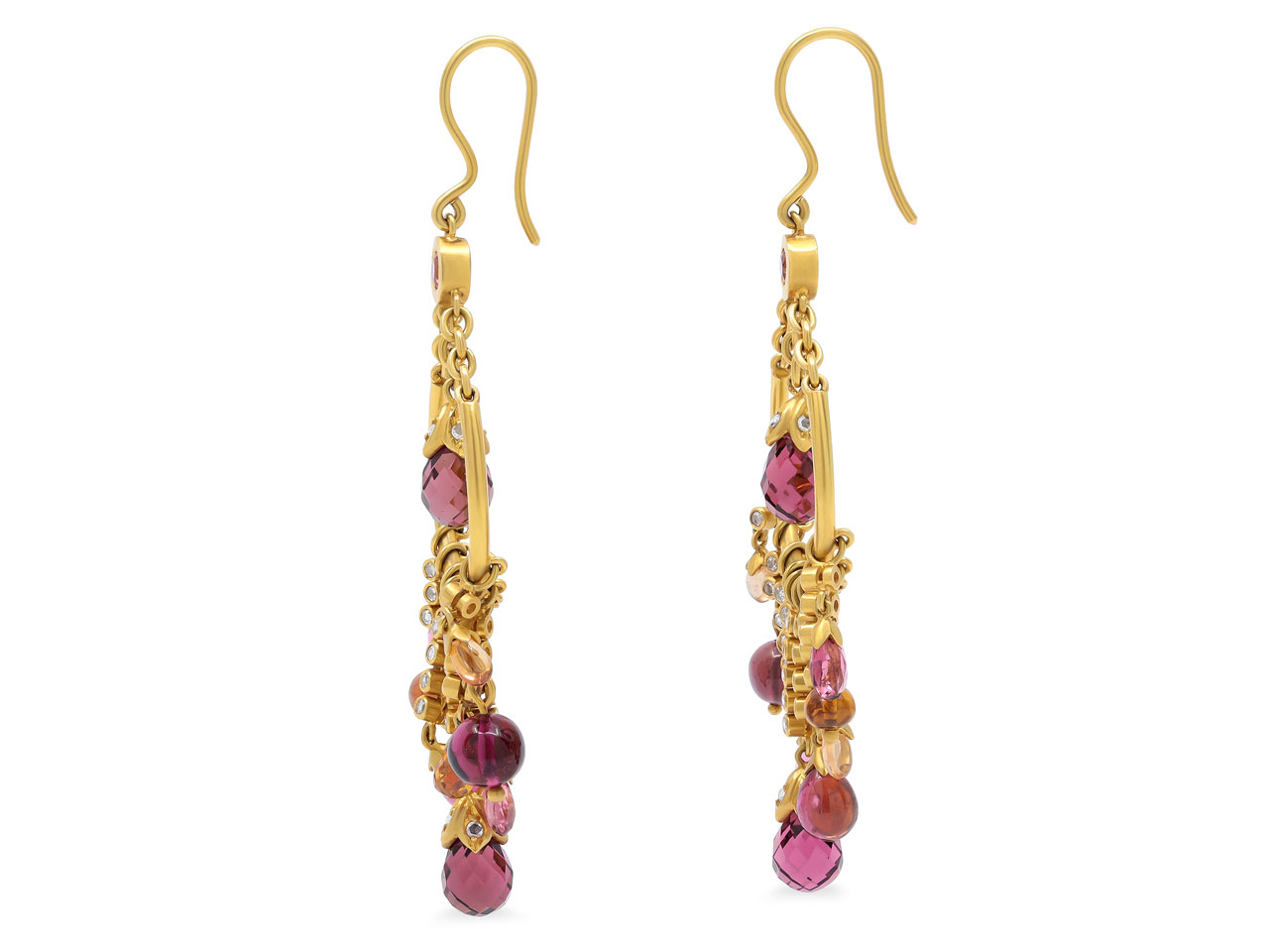 A dazzling medley of jewels in rich sunset tones for a sexy bohemian look. These signed designer earrings from crown jeweler Garrard are simply gorgeous, crafted in luxurious yellow gold with sparkling strands of bezel-set diamonds ending in pink tourmaline beads and briolettes.