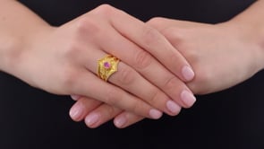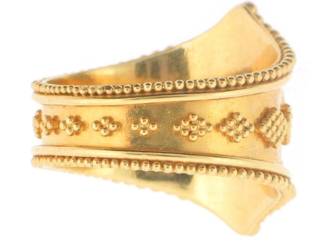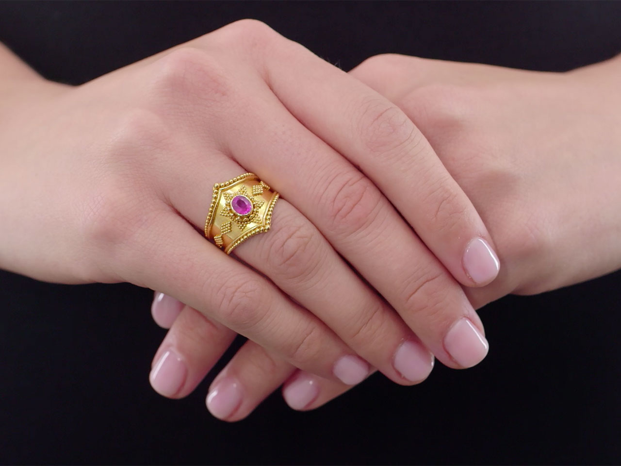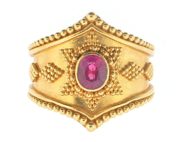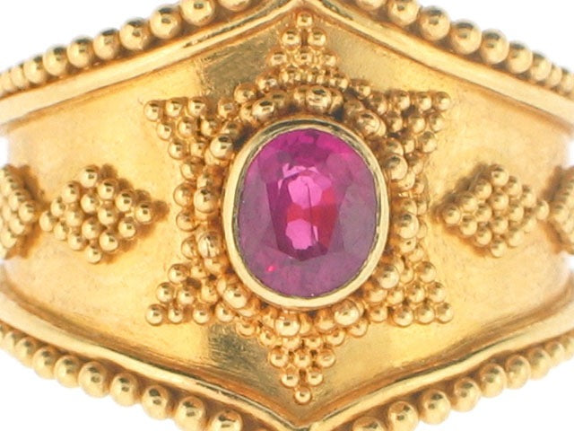 Etruscan styled opulence in high karat yellow gold with fine beaded detail along the outside of the band and in diamond formations surrounding a center oval-cut cherry red Burma ruby.