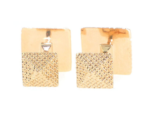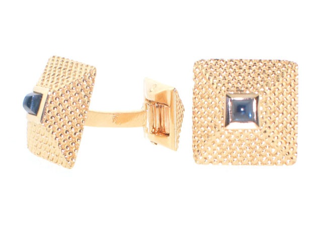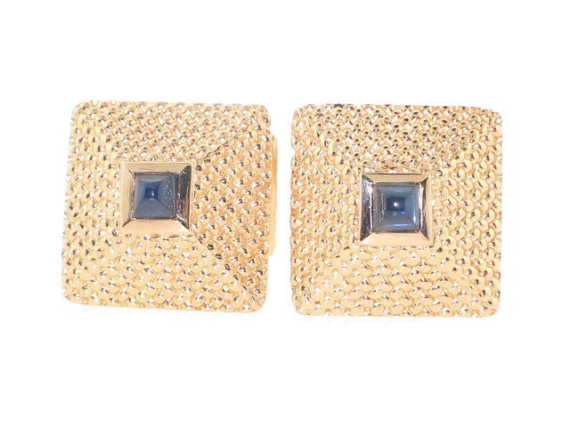 This handsome pair of cufflinks feature textured gold four-sided pyramids capped by sugarloaf cabochon sapphires. These estate sapphire have Swiss hallmarks.