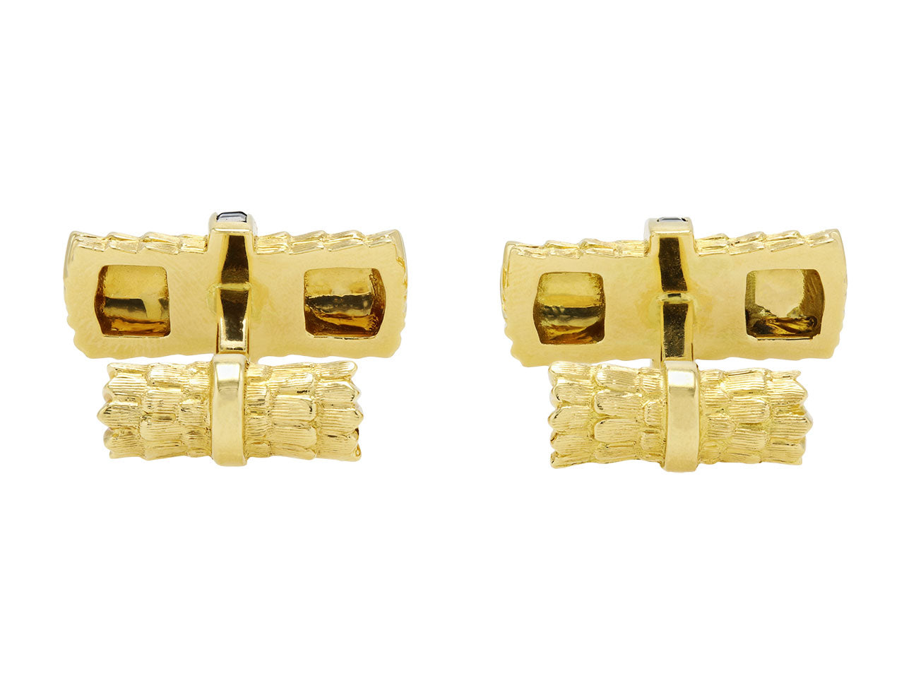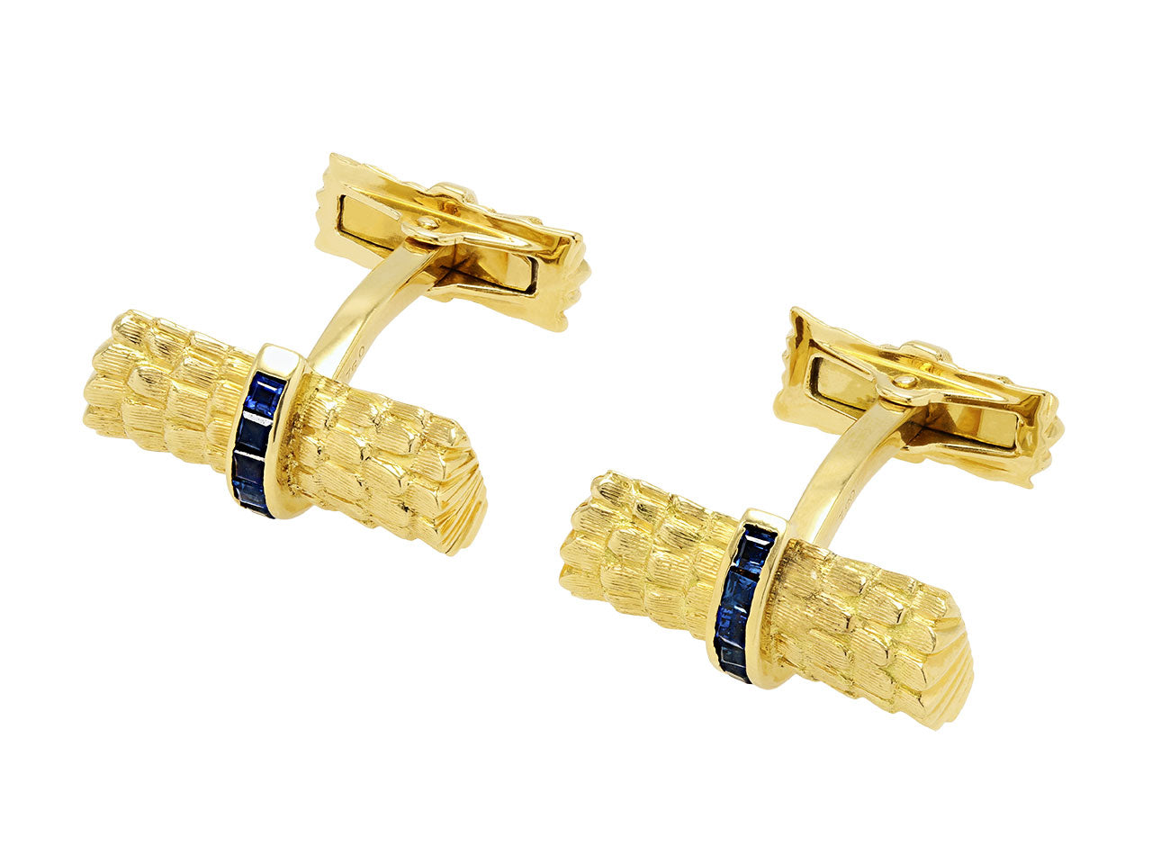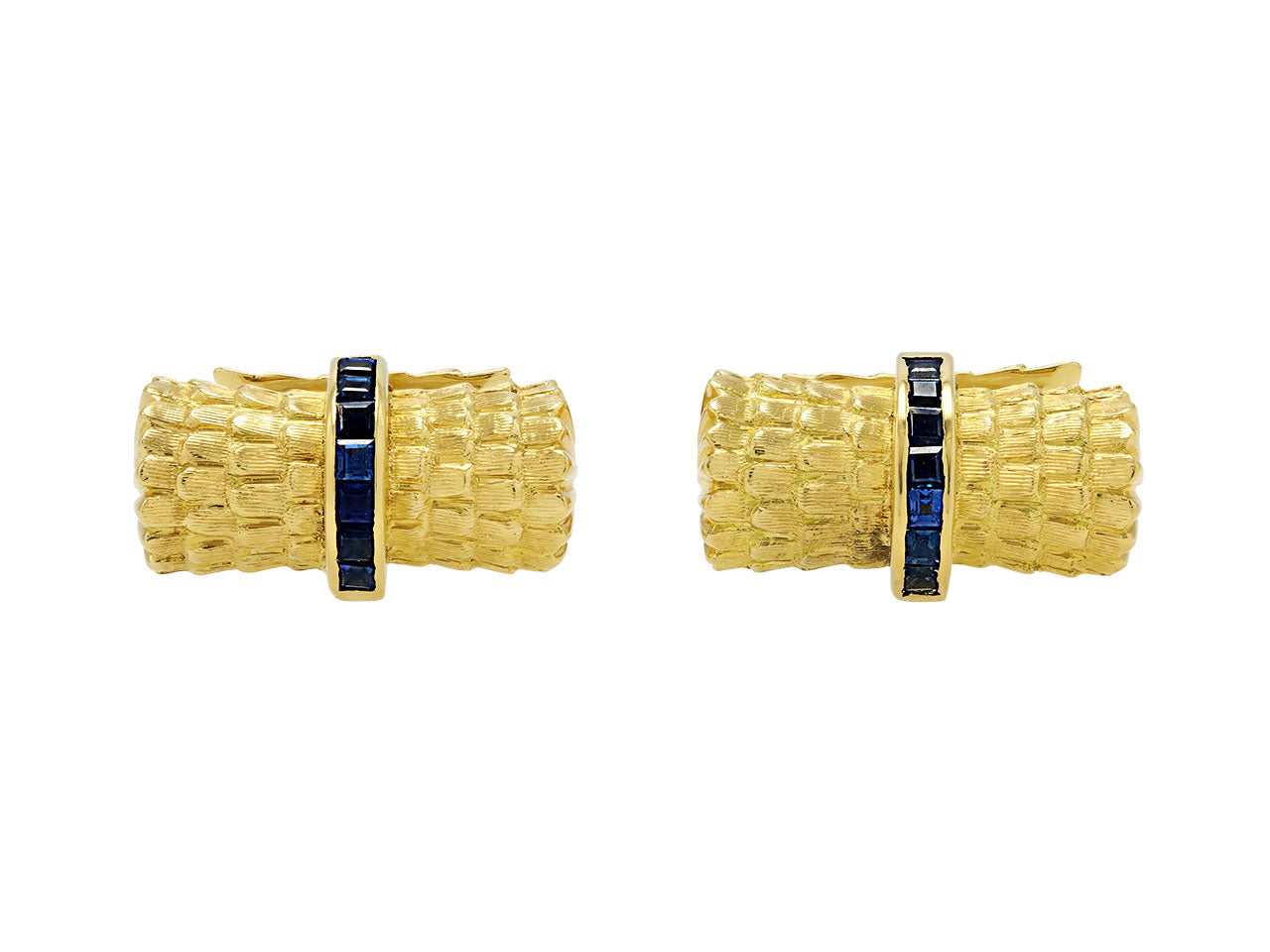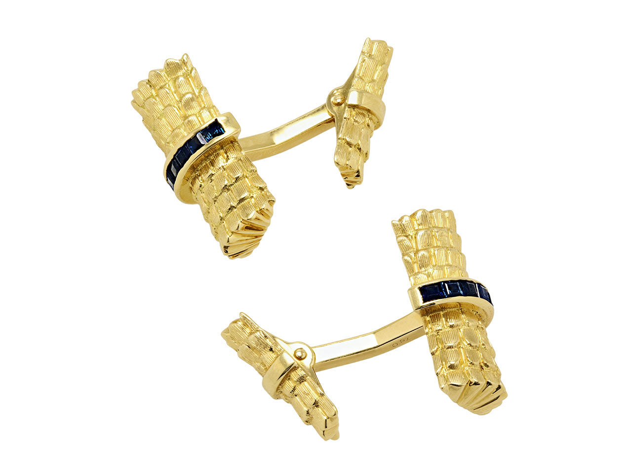 Textured gold resembles thatching in these chic sapphire bar cufflinks. The bars are bisected by bands of channel set sapphires and sided with scalloped detailing in high-polished gold.