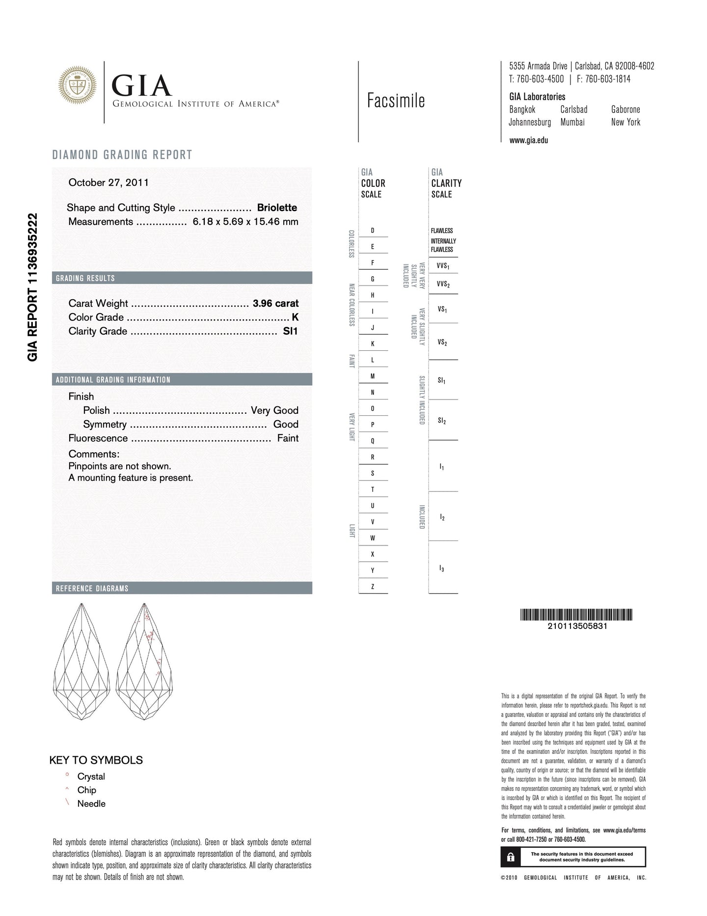 - Gem Stone: Center Diamond 3.96 carats Briolette cut K/SI-1 GIA #1136935222