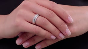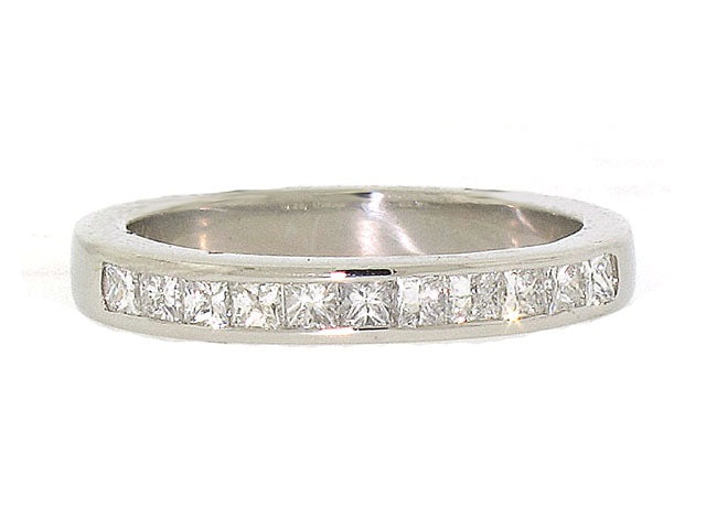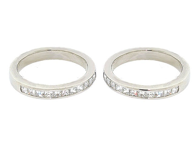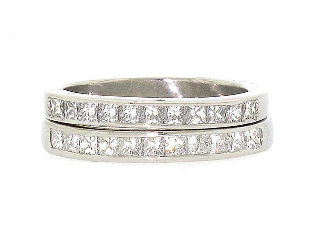 Stack it up in style with this scintillating pair of diamond bands. Sleek and slender in polished platinum, each band features a single row of channel set princess-cut diamonds across the top.