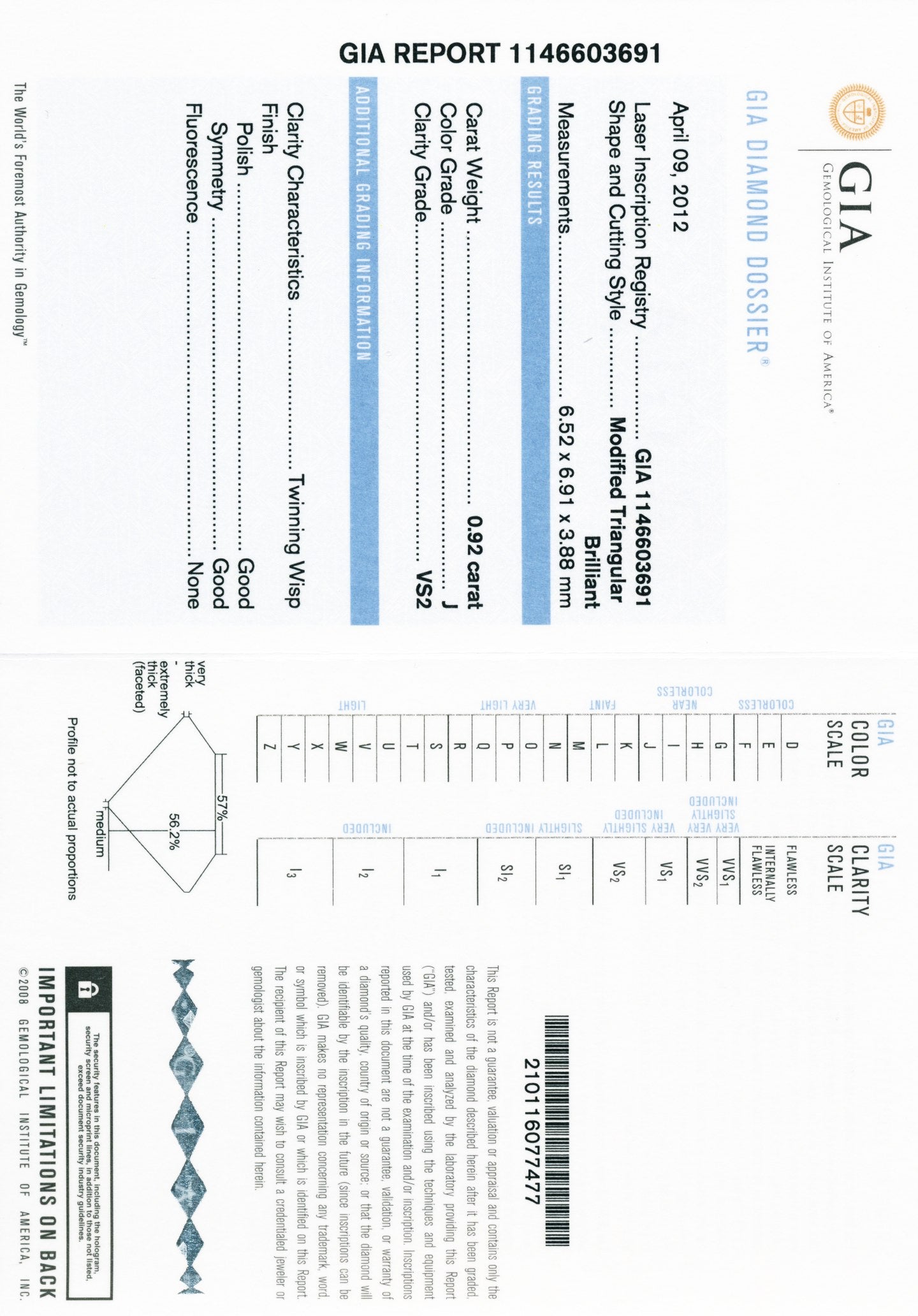 - Gem Stone: Diamond 0.92 carats Trillion cut J/VS-2 GIA #1146603691