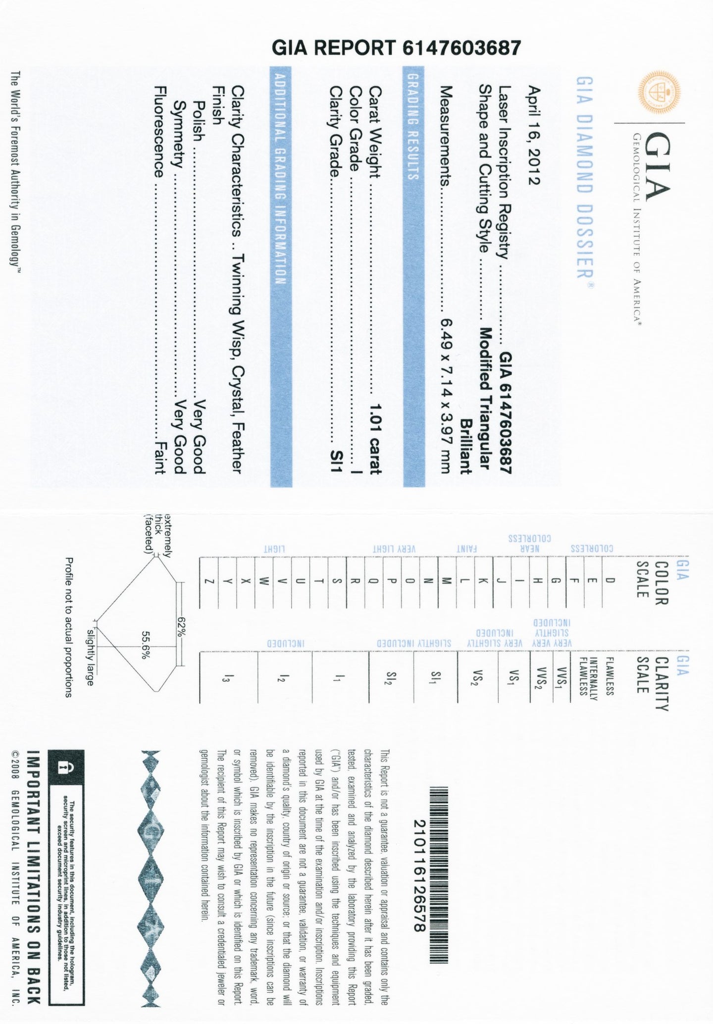 - Gem Stone: Diamond 1.01 carats Trillion cut I/SI-1 GIA #6147603687