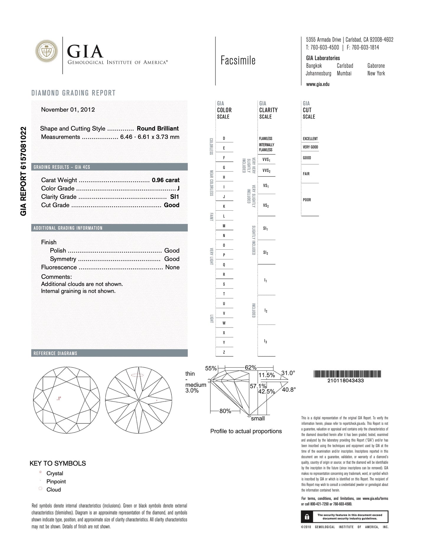 - Gem Stone: Center Diamond 0.96 carats Round Brilliant cut J/SI-1 GIA #6157081022