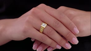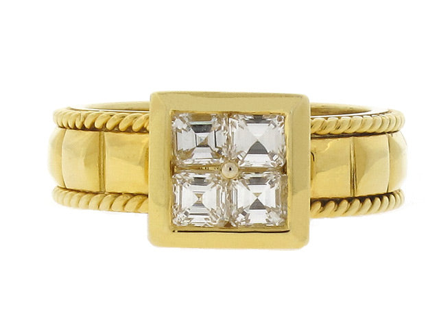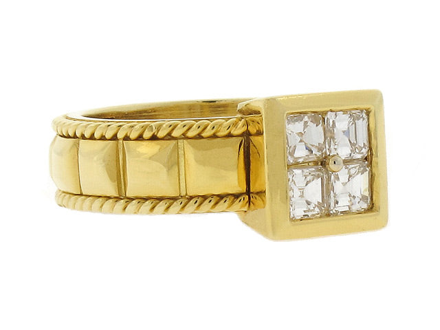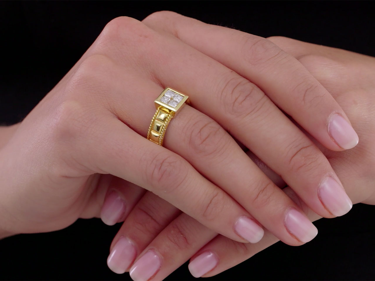 A bold modern look, this diamond ring is sure to please. A studded style of high polish yellow gold features rope detailing at the top and bottom borders of the band and a central square set motif of a quartet of square-cut diamonds.