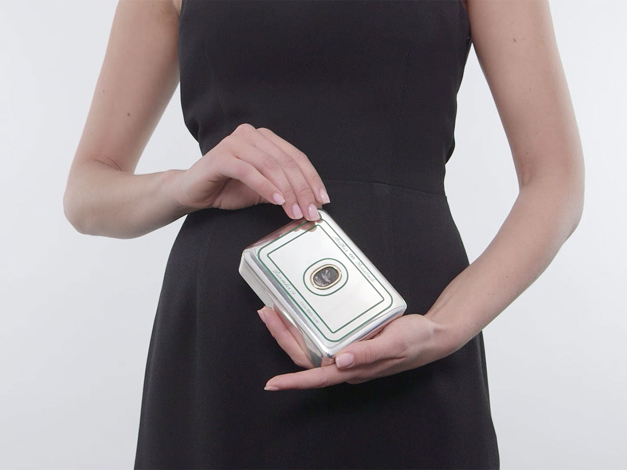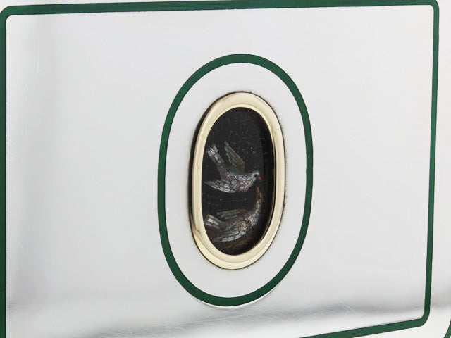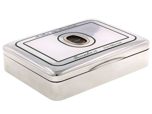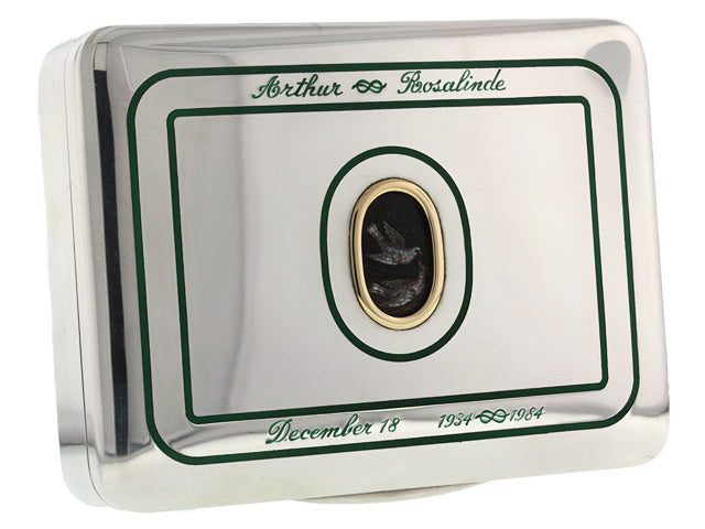 A commemorative box from a world-renowned silver, antiques and objet d'art collector, this micromosaic embellished box is a special piece of history. Commissioned to celebrate the 50th wedding anniversary of famed collectors Arthur and Rosalinde Gilbert, this sterling silver Italian made box features green enamel detail, including the couple's names and their wedding date all surrounding a central micromosaic of a pair of doves. This specially made box was crafted by G. Petochi of the famed Italian jeweler family, who specialized in silversmithing and the art of the micromosaic. Arthur and Rosalinde Gilbert were world-renowned for their collection — particularly of boxes and micromosaics — so this item is an extraordinary memento of their lives, love and mutual passion.