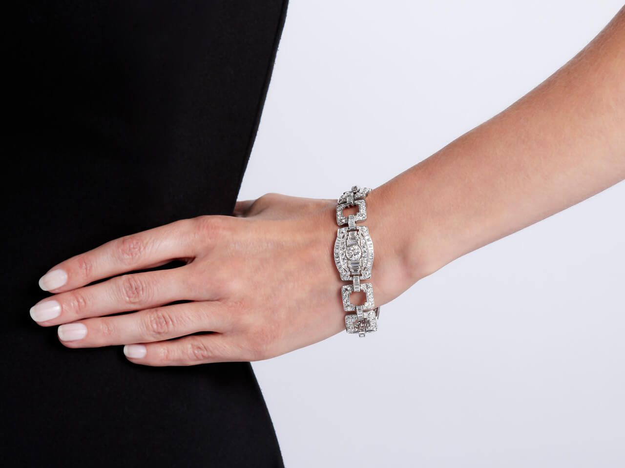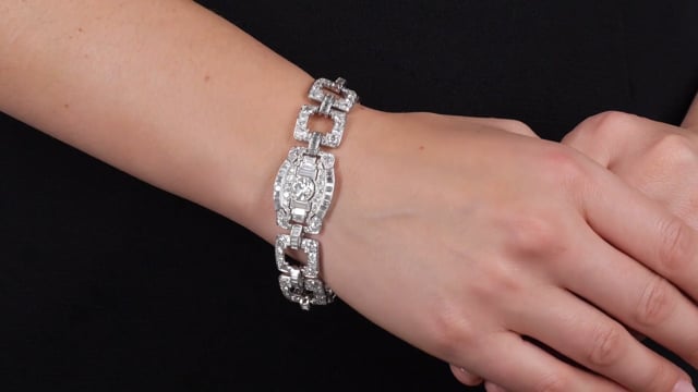 The center panel bezel-set with an old European-cut diamond, flanked by a trio of baguette-cut diamonds, between lines of round and baguette diamonds, to old European-cut diamond-set openwork square links joined by baguette-cut diamond links, in platinum.