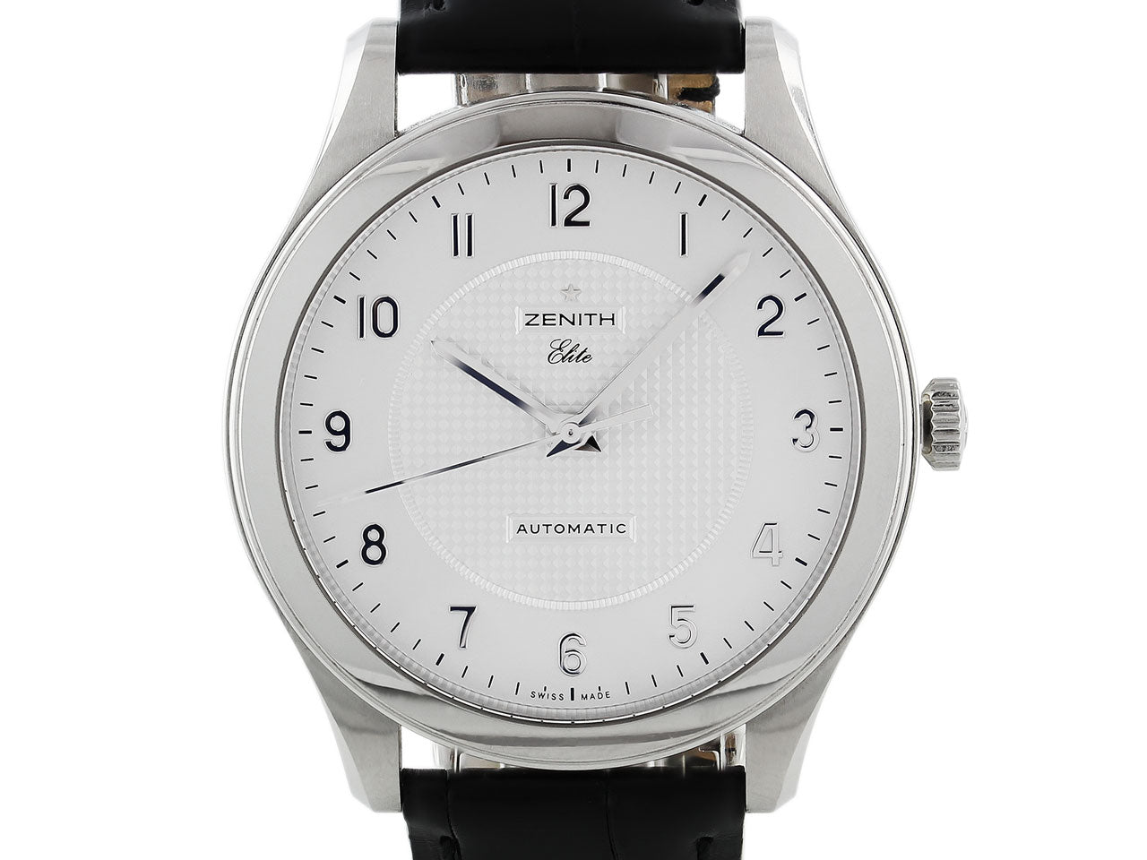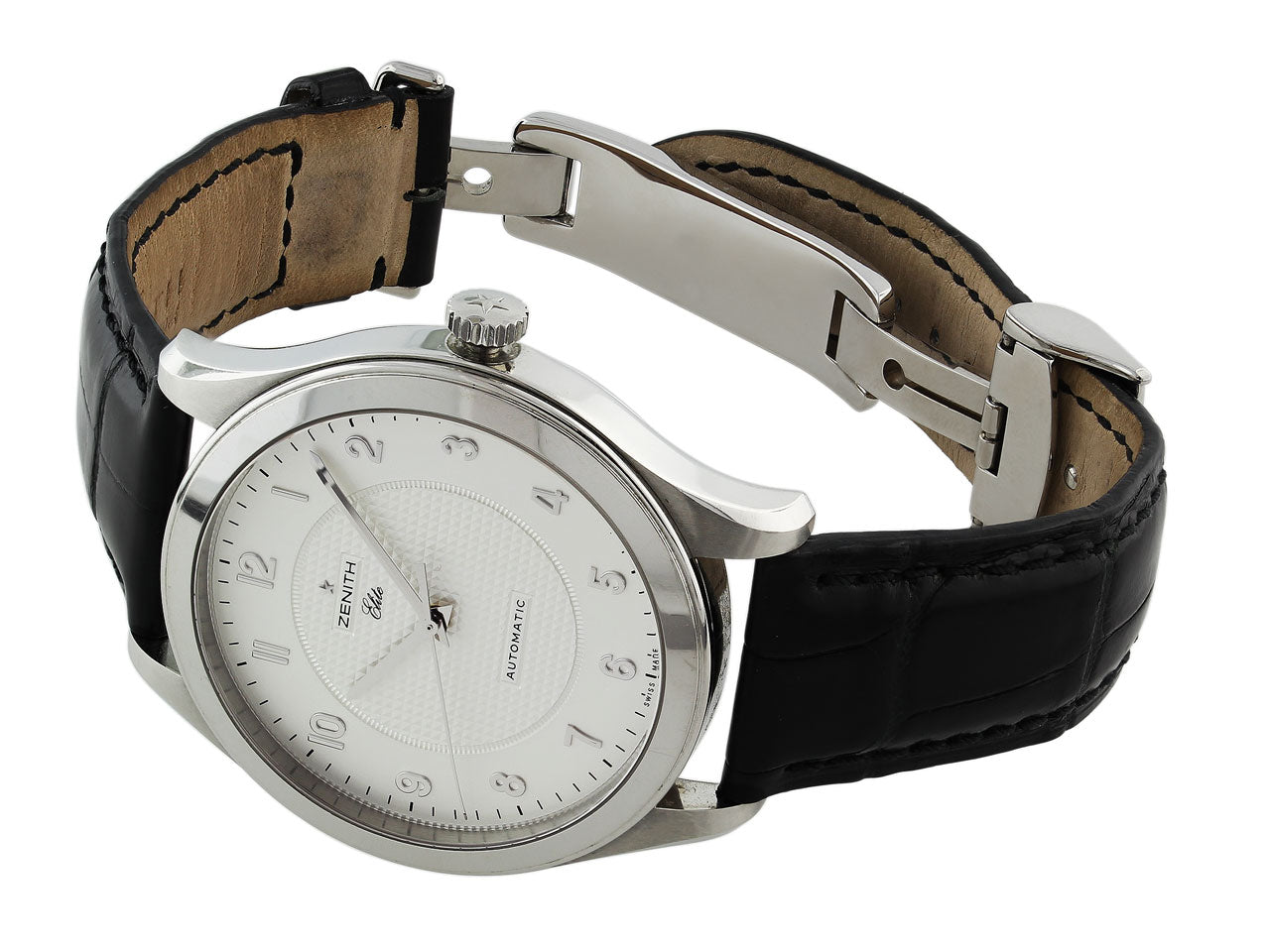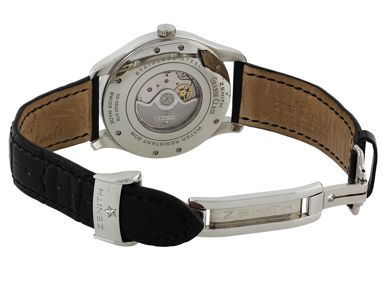 A bright, bold look, this automatic Zenith watch is the apex of minimalist chic. A large round dial features a simplistic face edged by a stainless steel bezel while the reverse features a skeleton back. The black leather band can be adjusted for length. Dial, movement, case and strap signed Zenith.