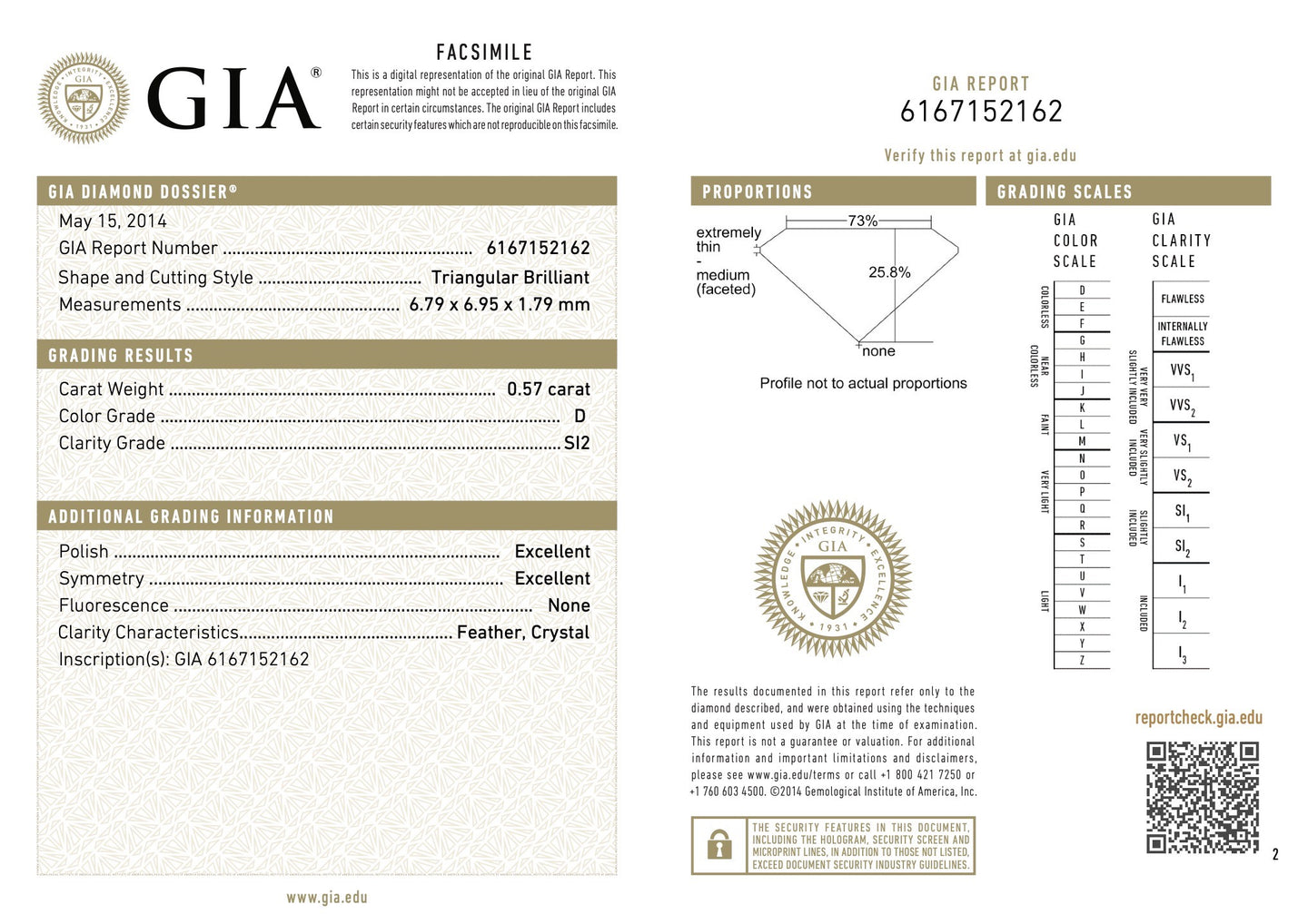- Gem Stone: Diamond 0.57 carats Triangular Brilliant cut D/SI-2 GIA #6167152162