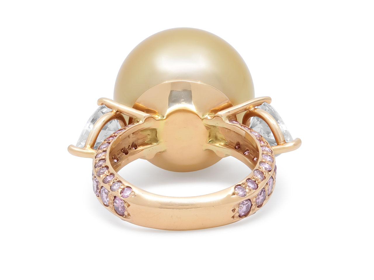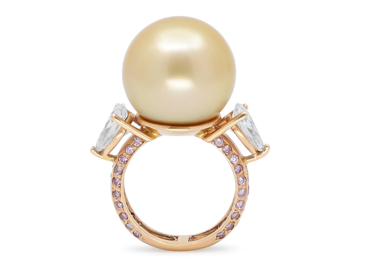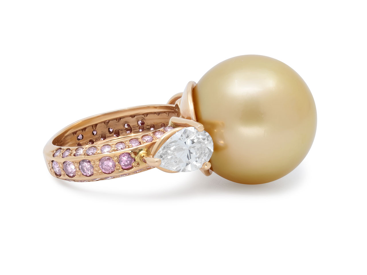 Sleek and sumptuous, this gold South Sea pearl and diamond ring is a true show-stopper! A large golden South Sea pearl crowns a luxurious rose gold ring set with pink diamonds along the mounting and a pair of pear-shaped diamonds along the shank.