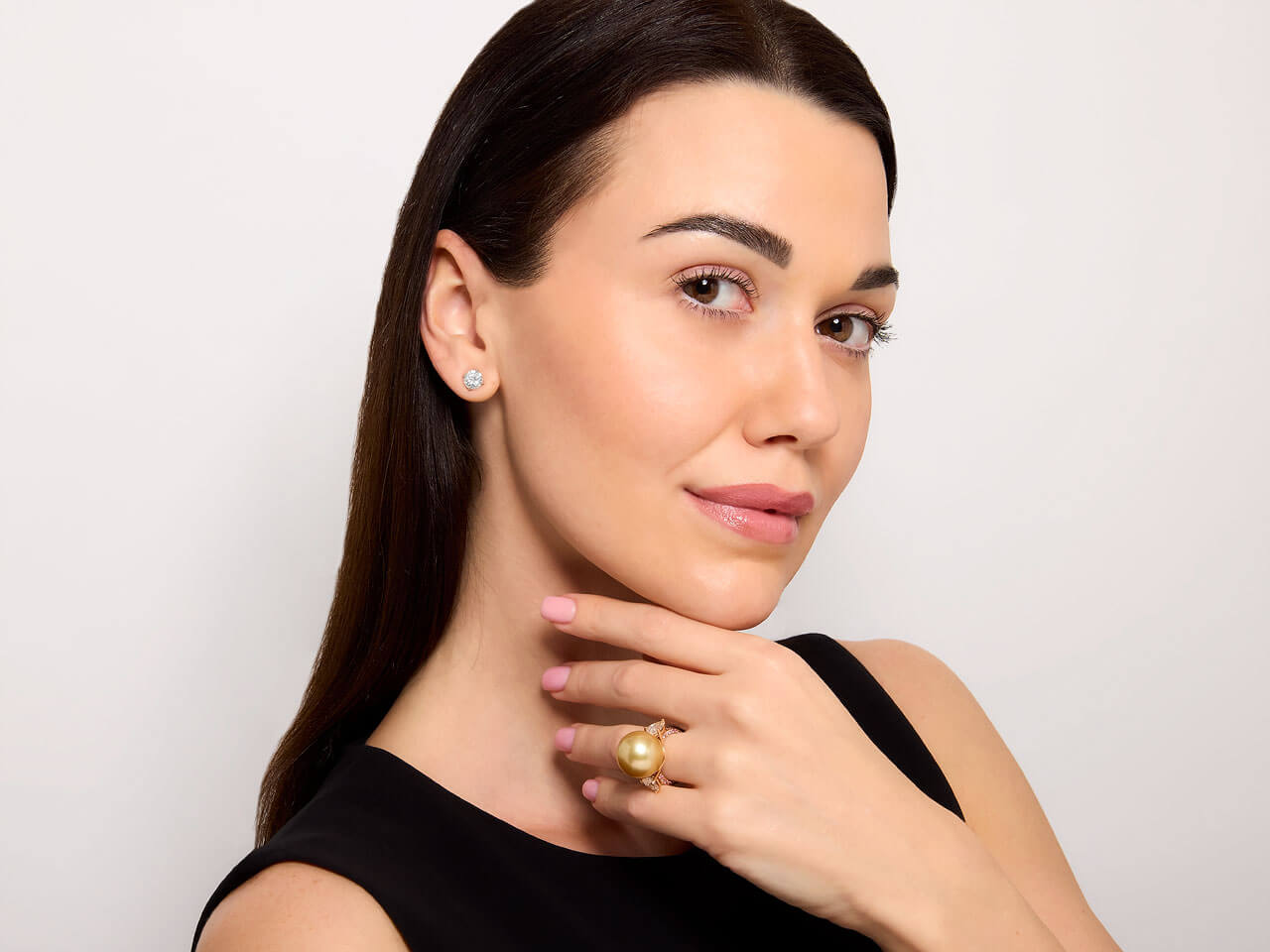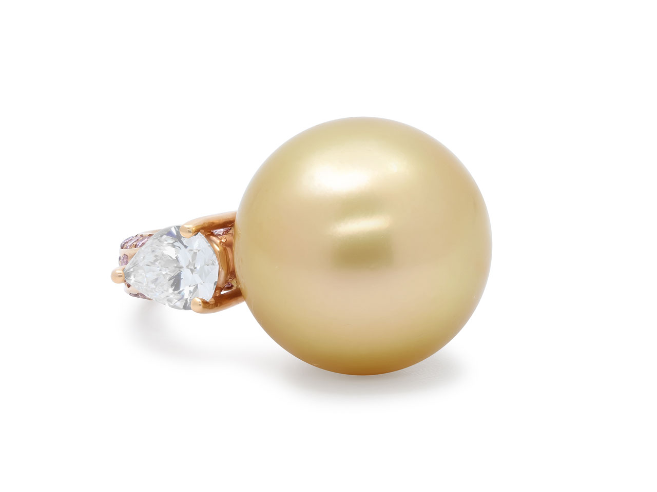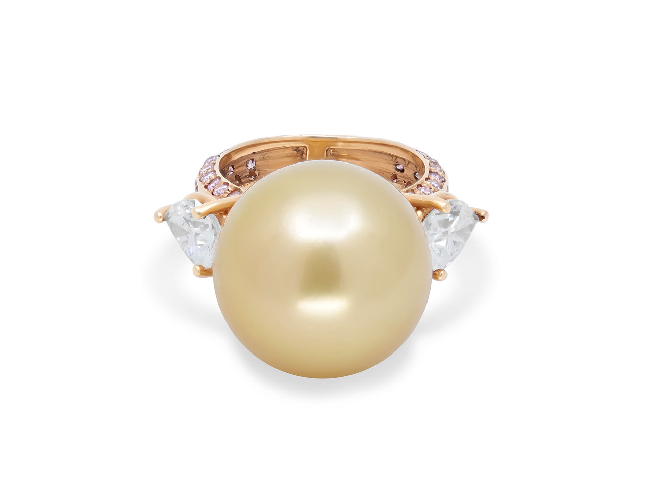 Sleek and sumptuous, this gold South Sea pearl and diamond ring is a true show-stopper! A large golden South Sea pearl crowns a luxurious rose gold ring set with pink diamonds along the mounting and a pair of pear-shaped diamonds along the shank.