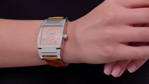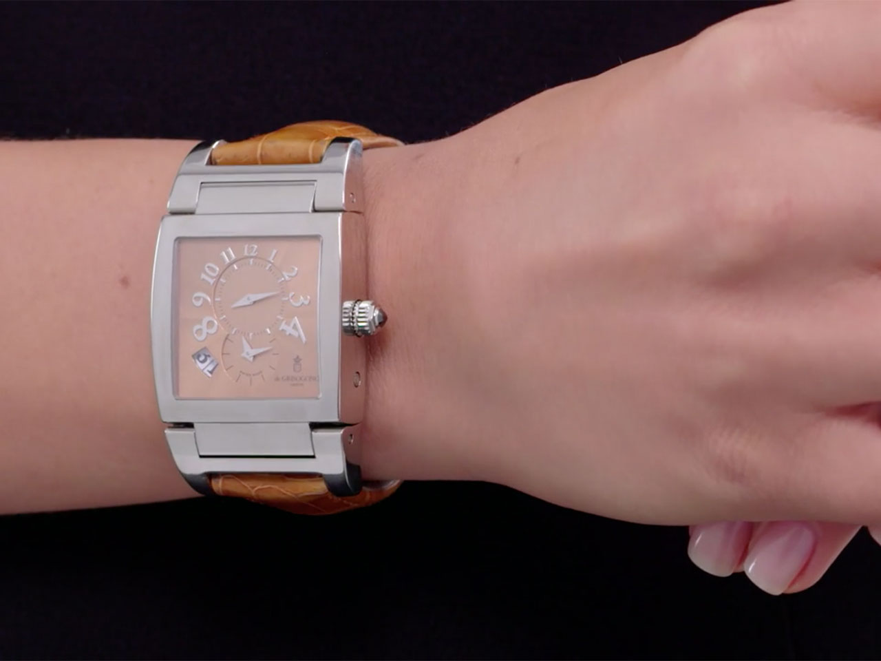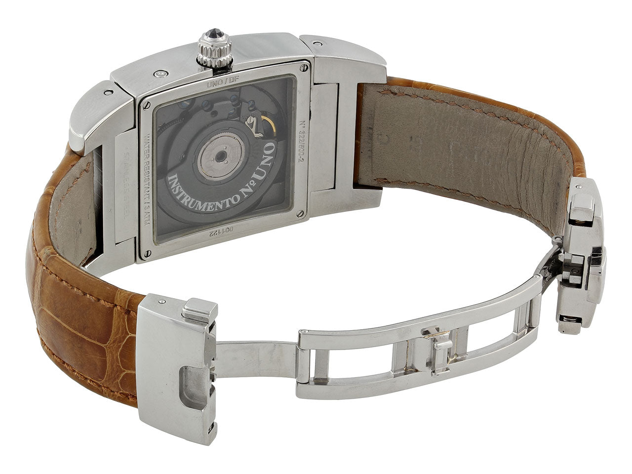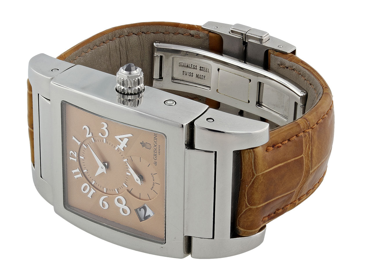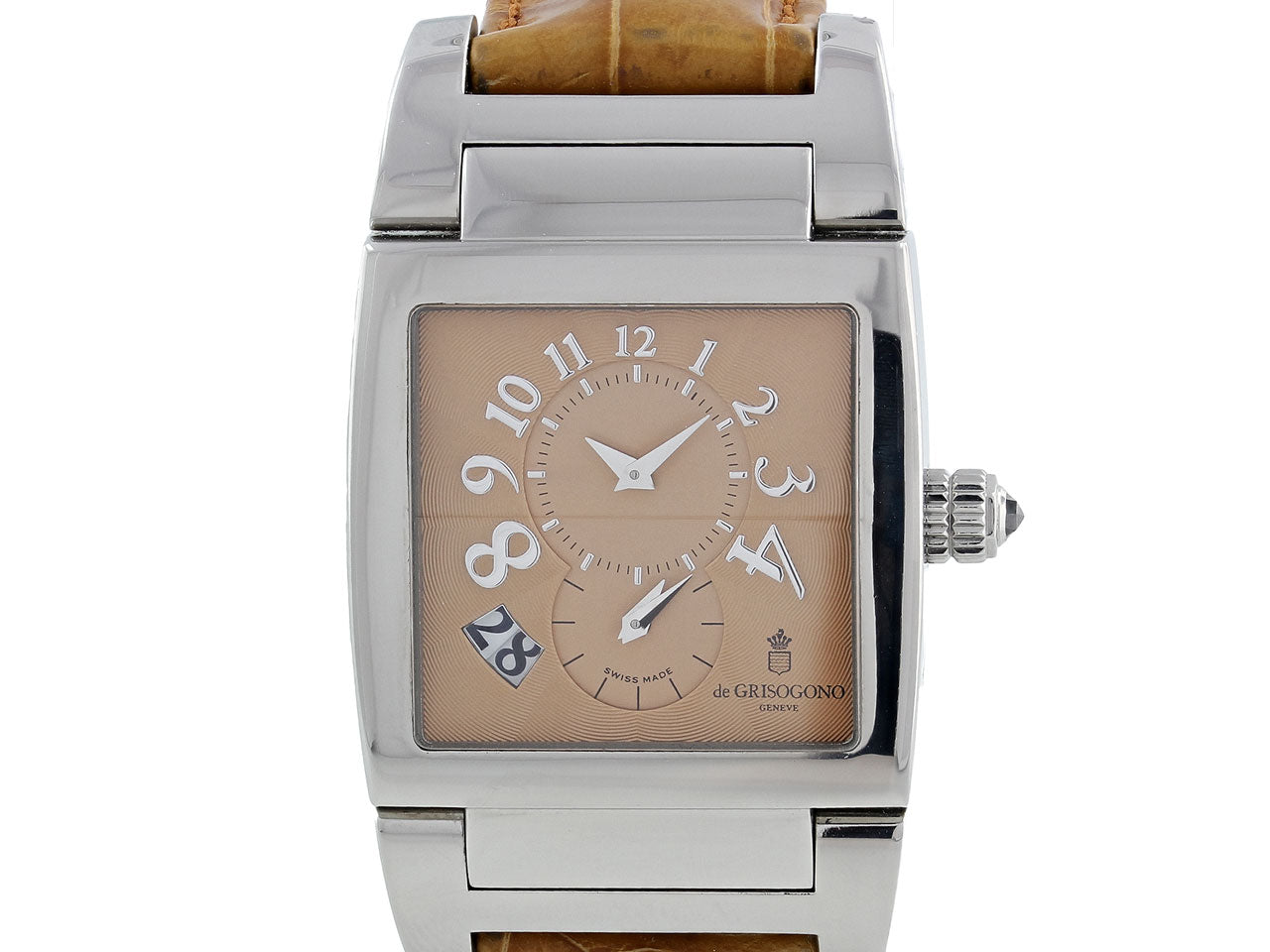 A bold statement watch by luxury Swiss brand, De Grisogono, this timepiece from the "Instrumento N. Uno" collection offers an elegant neutral design. A solid square-shaped face features a stainless steel bezel framing a guilloche enamel dial in a smooth caramel color. This pre-owned timepiece features a deployant buckle and a skeleton back. Dial signed de Grisogono.