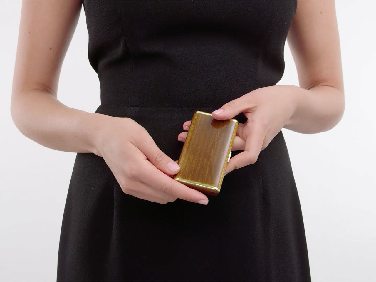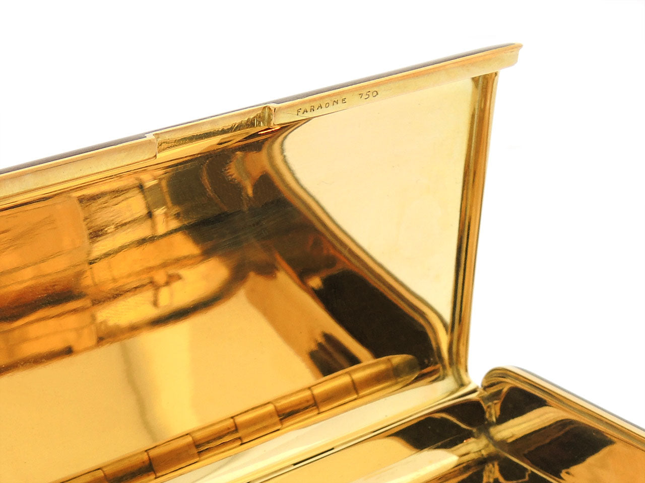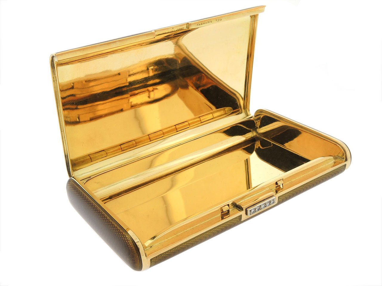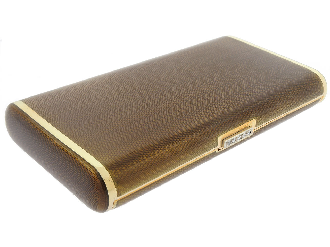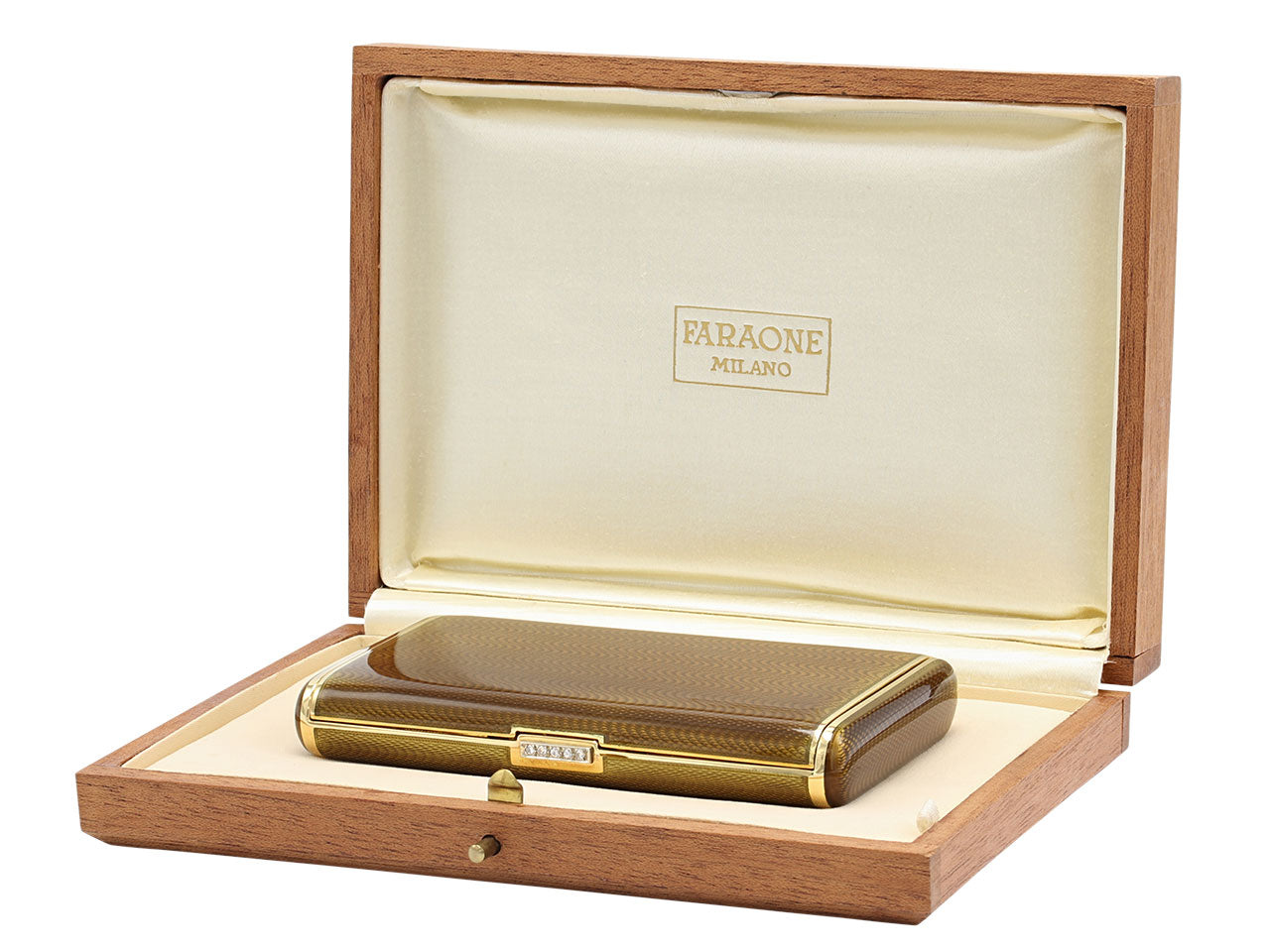 Of rectangular outline with rounded corners, guilloché brown enamel exterior, the diamond pushpiece revealing a polished interior fitting standard 84 mm (3.3 inch) cigarettes. Signed Faraone. Includes manufacturer's box.
