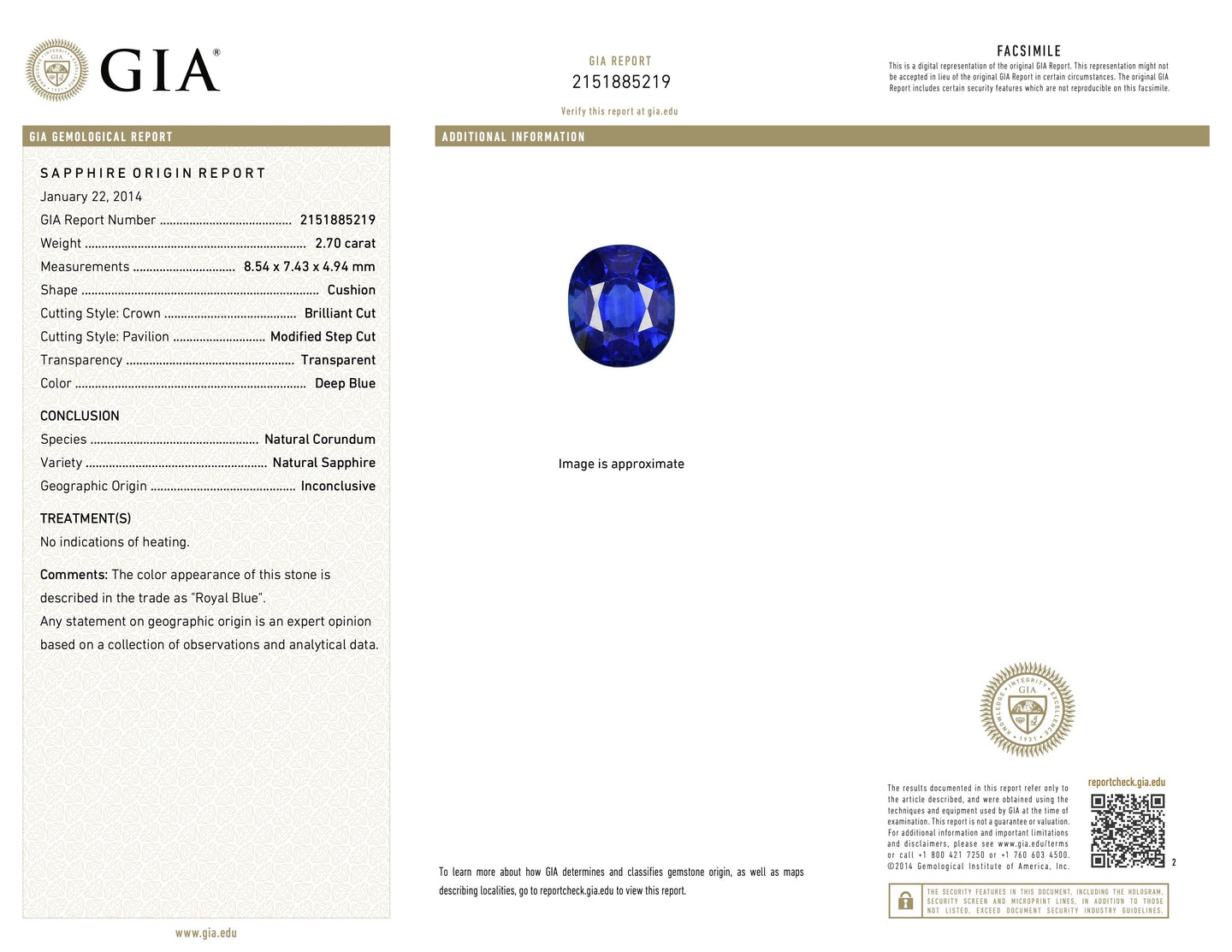 - Gem Stone: Sapphire 2.70 carats/No Heat Cambodian Origin; AGL Report. GIA 2151885219