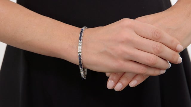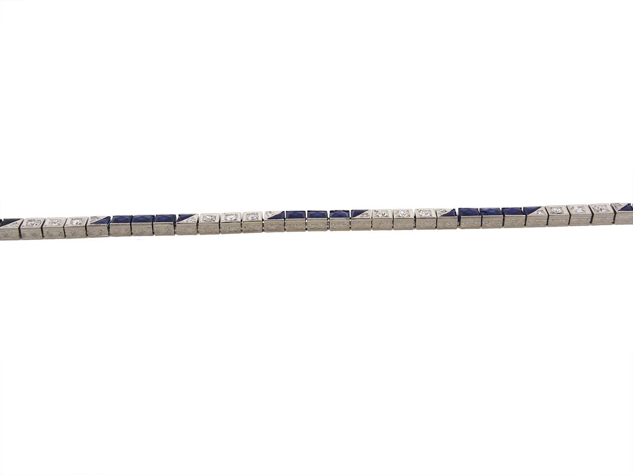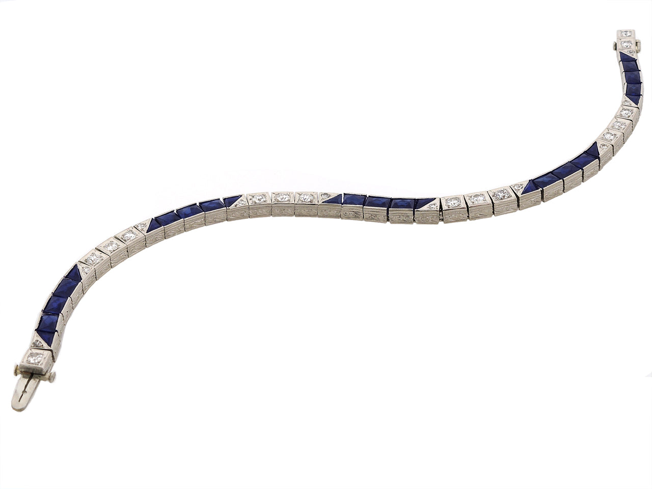 The line bracelet with alternating trios of old-cut diamond links and fancy-cut synthetic sapphire links, interspaced with links set with both diamond and sapphires, millegrain-set in platinum.