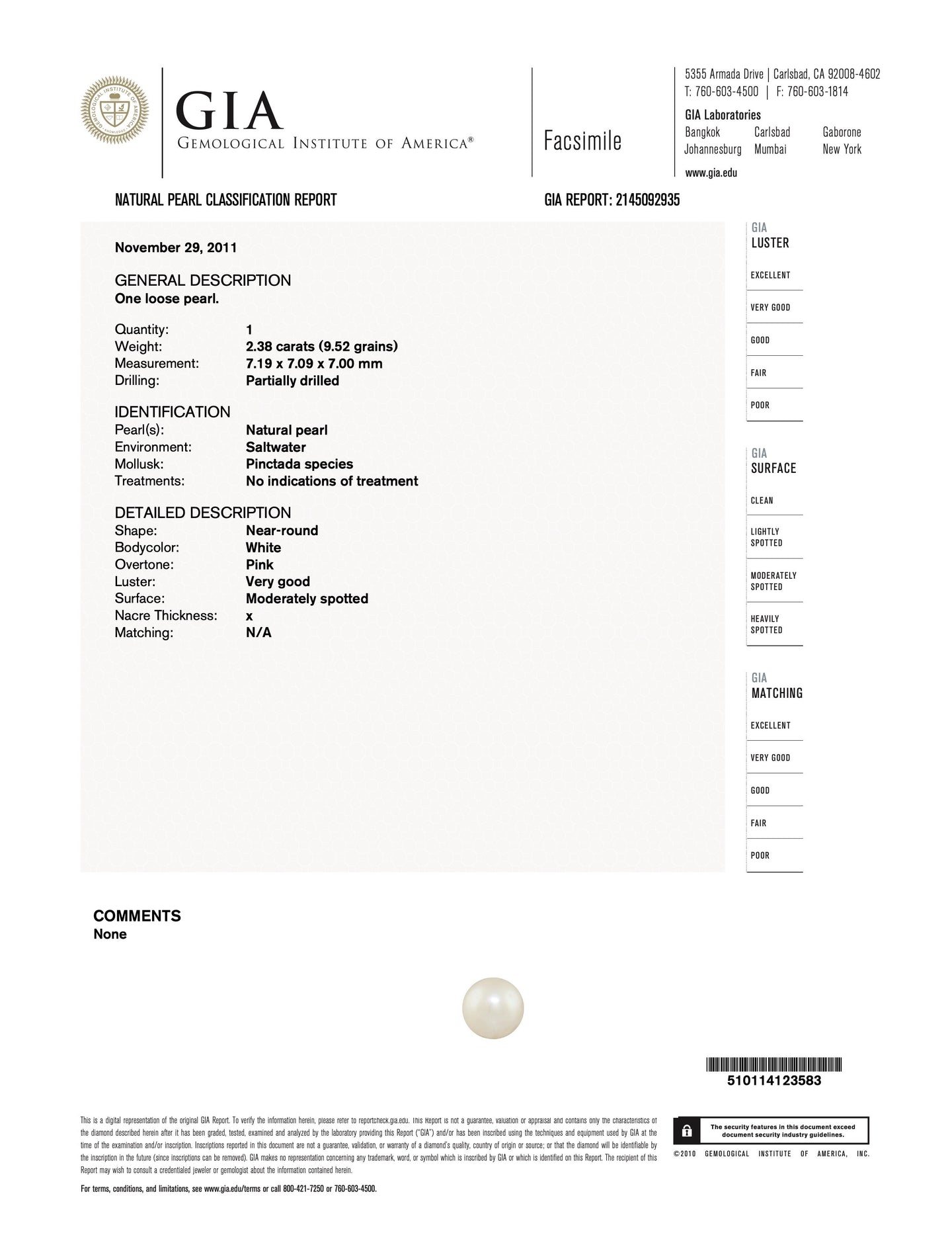 - Gem Stone: Natural Pearl 7.0 mm GIA No. 2145092935