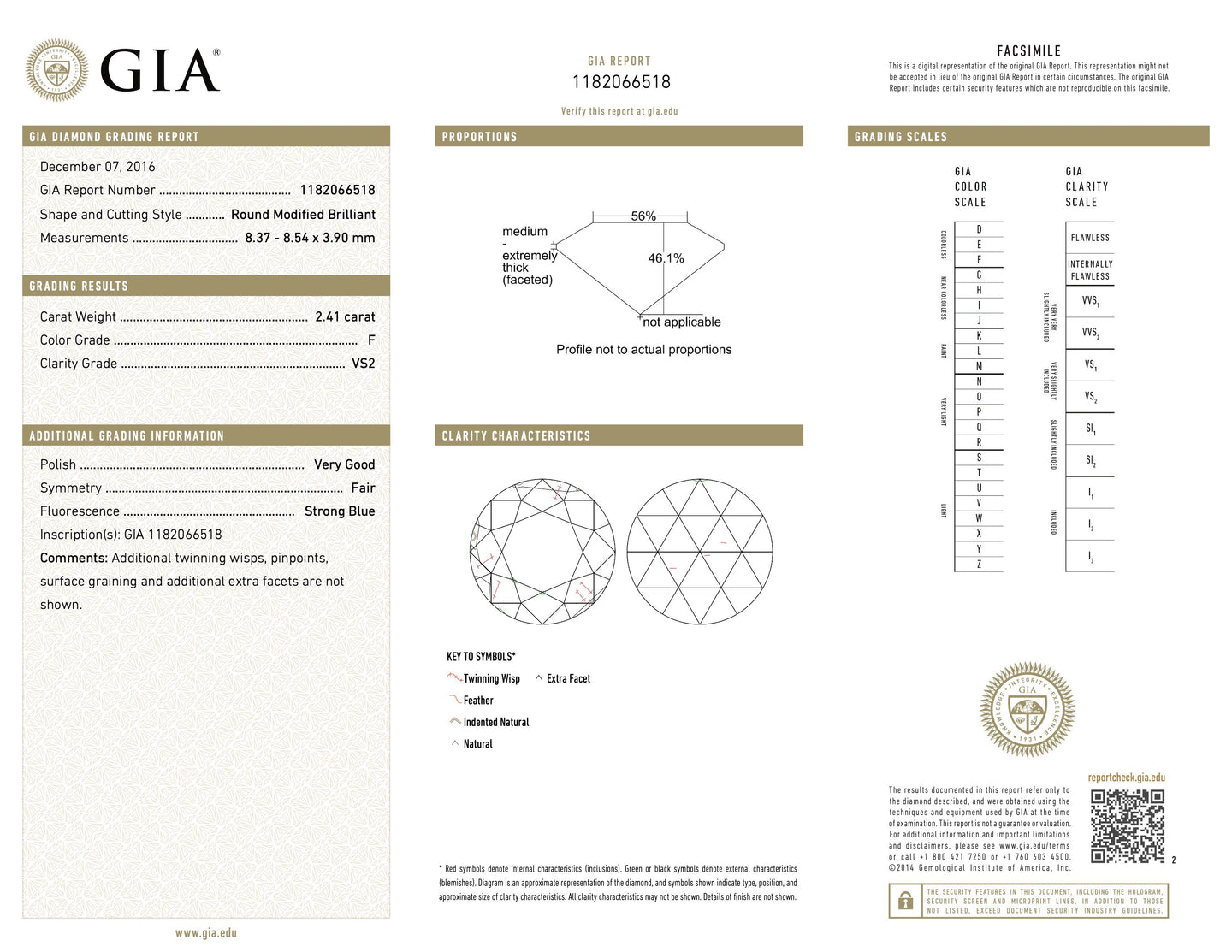 - Gem Stone: Diamond 2.41 carats Round Brilliant cut F/VS-2 GIA 1182066518