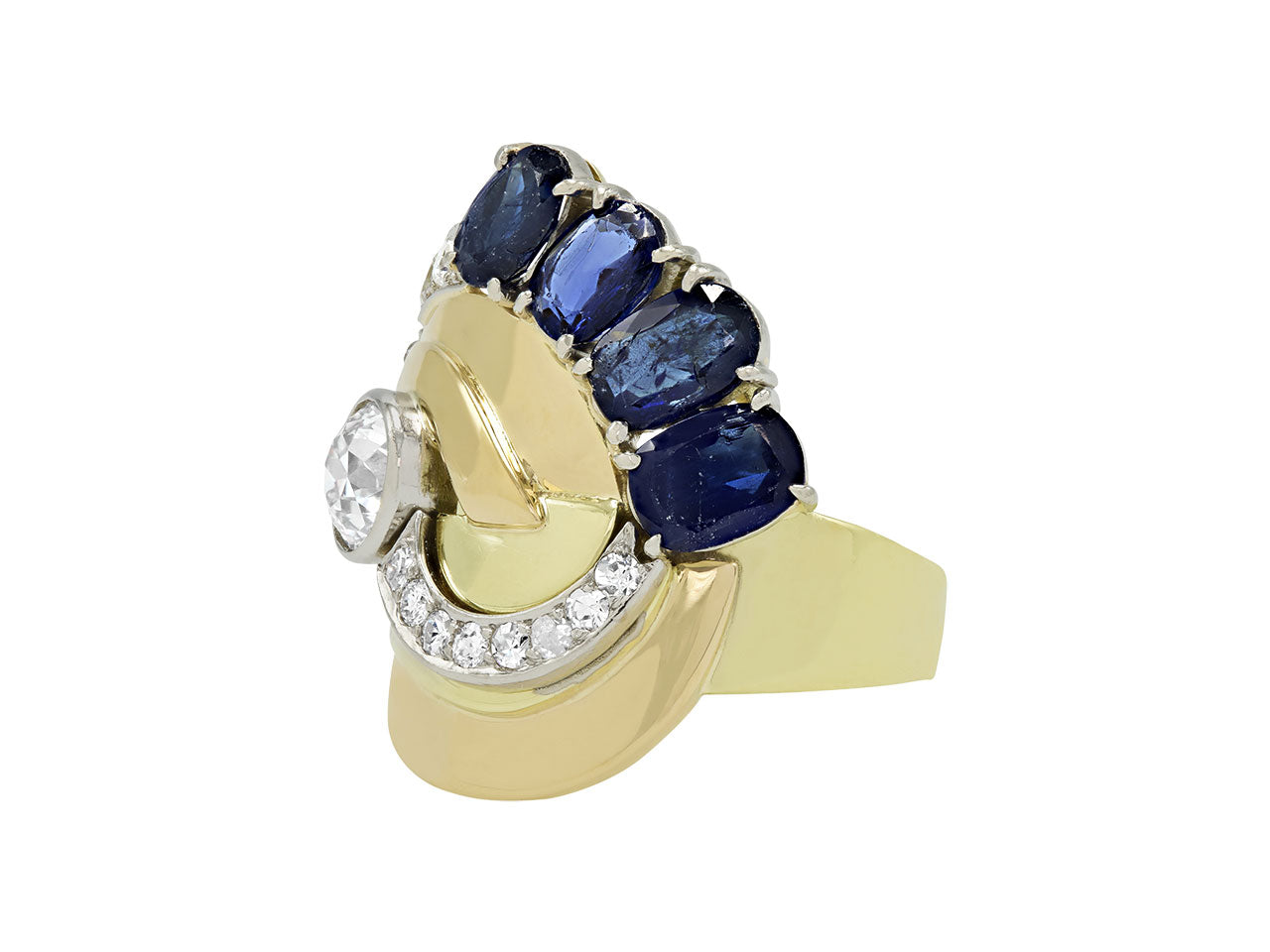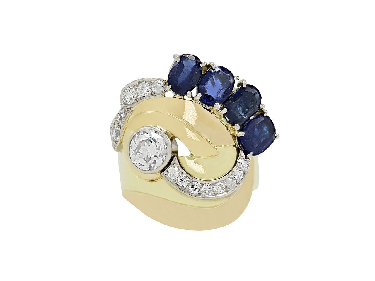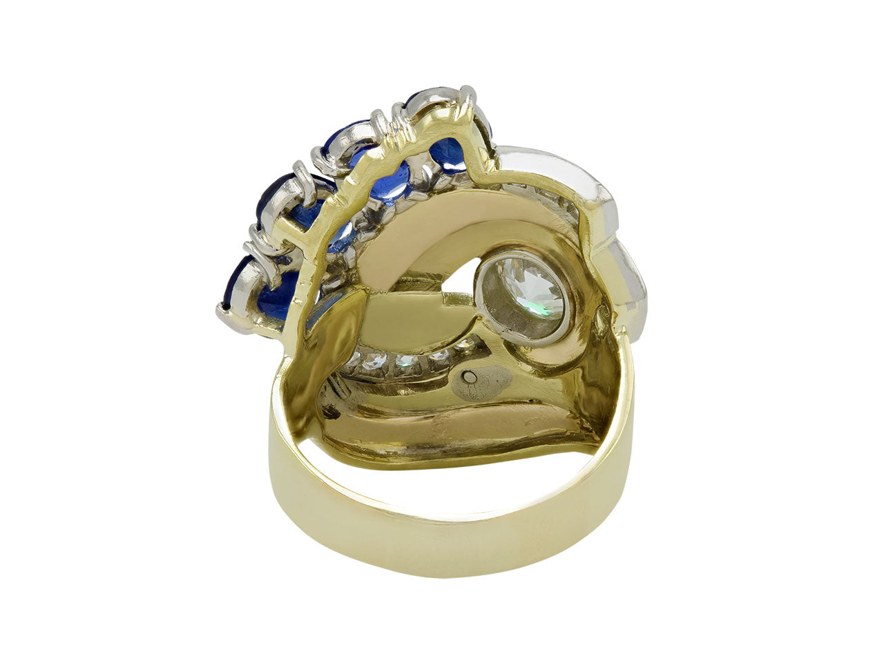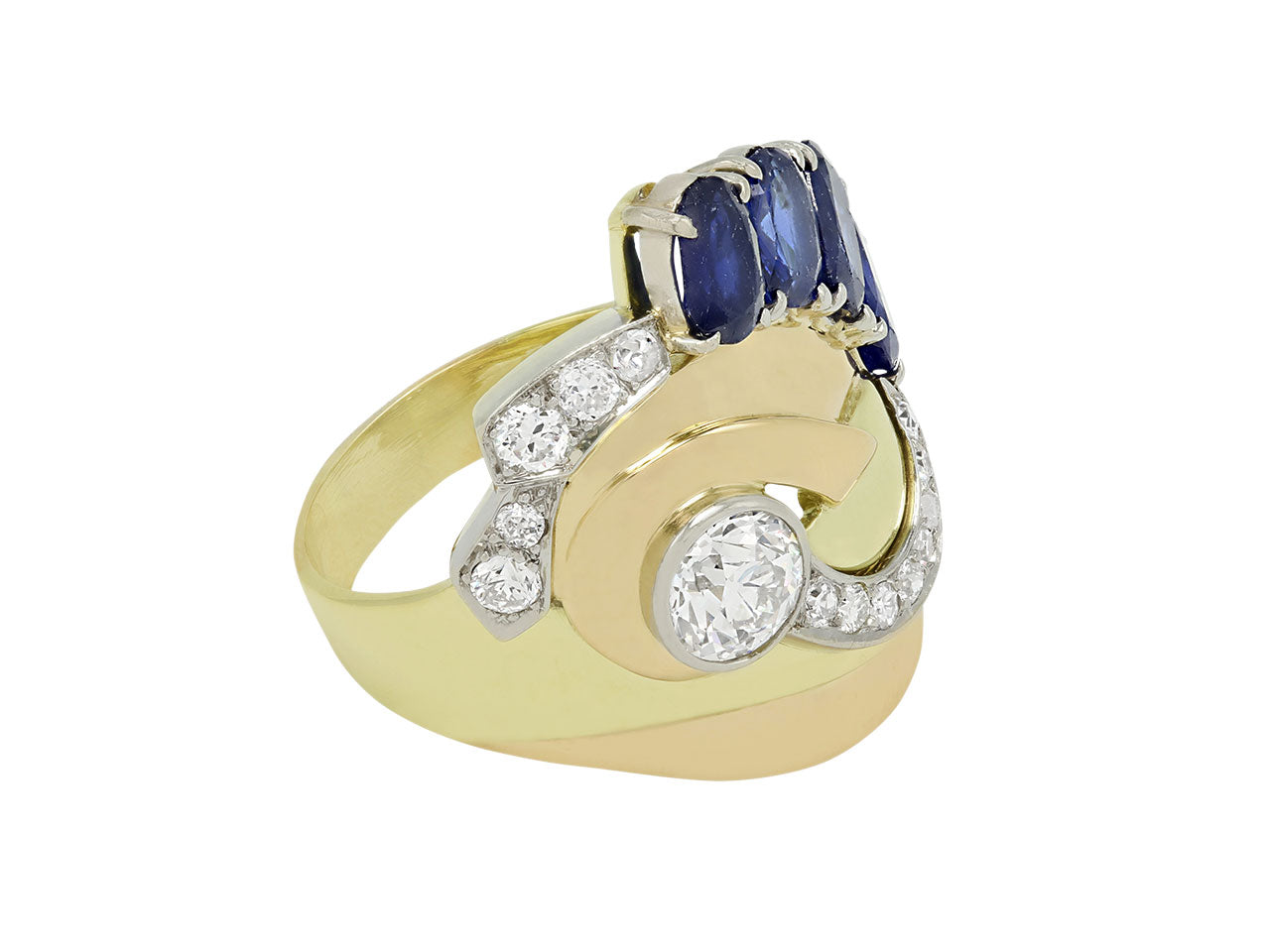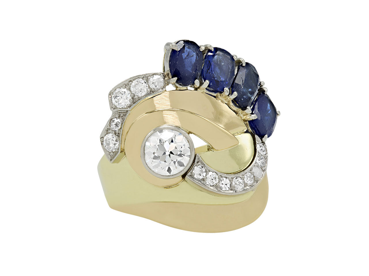 Of scroll design, composed of yellow and white gold ribbons, with an European-cut diamond center and graduating diamond lines, the top accented with a line of oval sapphires, in 18k gold.