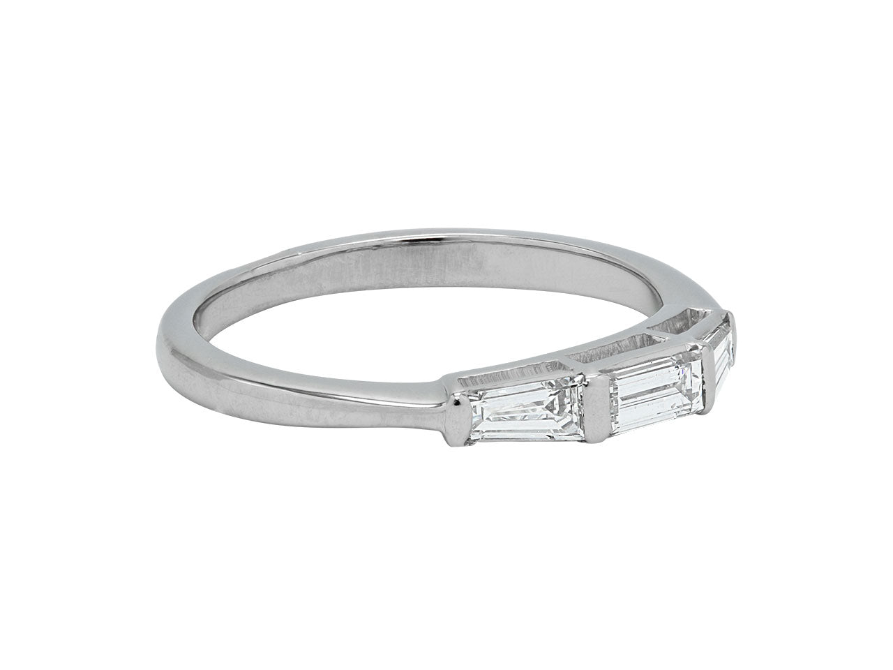 The ring top set with a baguette-cut diamond, flanked by a pair of tapered baguette-cut diamonds, to a platinum band.