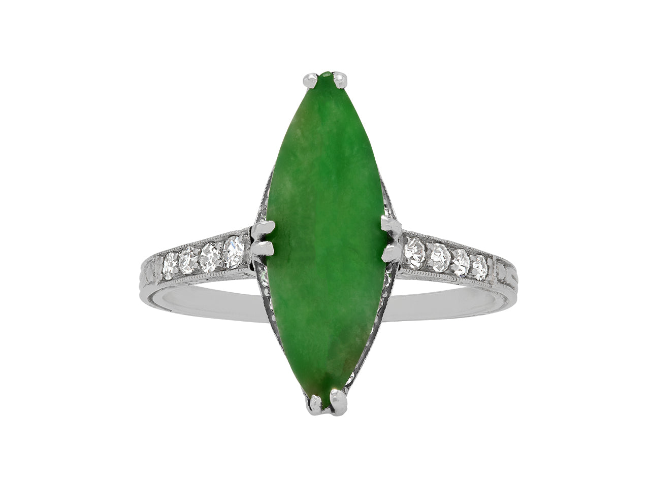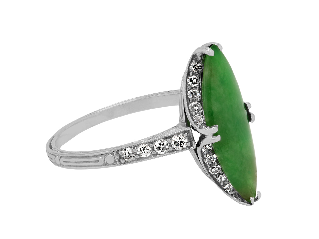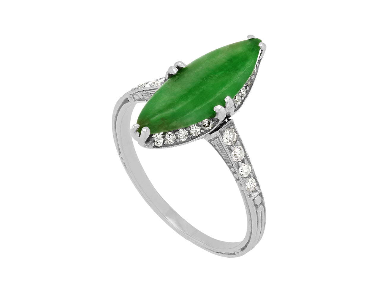 Prong-set with a navette-shaped green jade measuring 17.8 mm by 11.9 mm, with millegrain set diamond shoulders, to a platinum band with etched detailing.