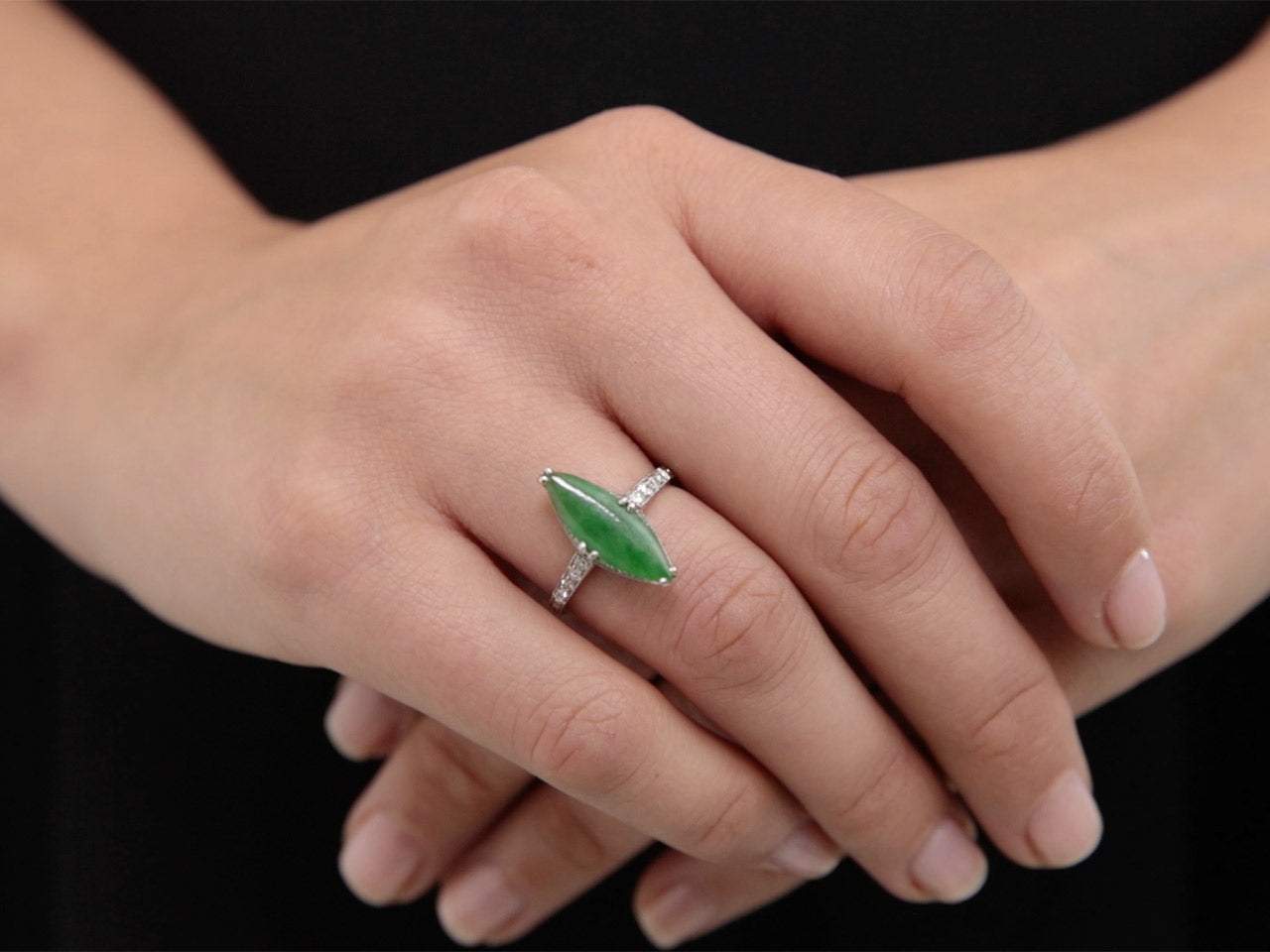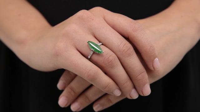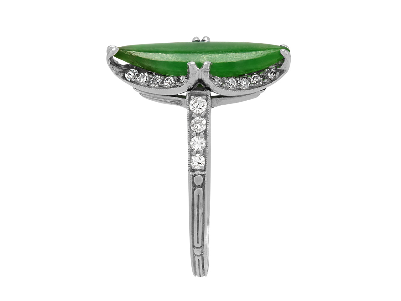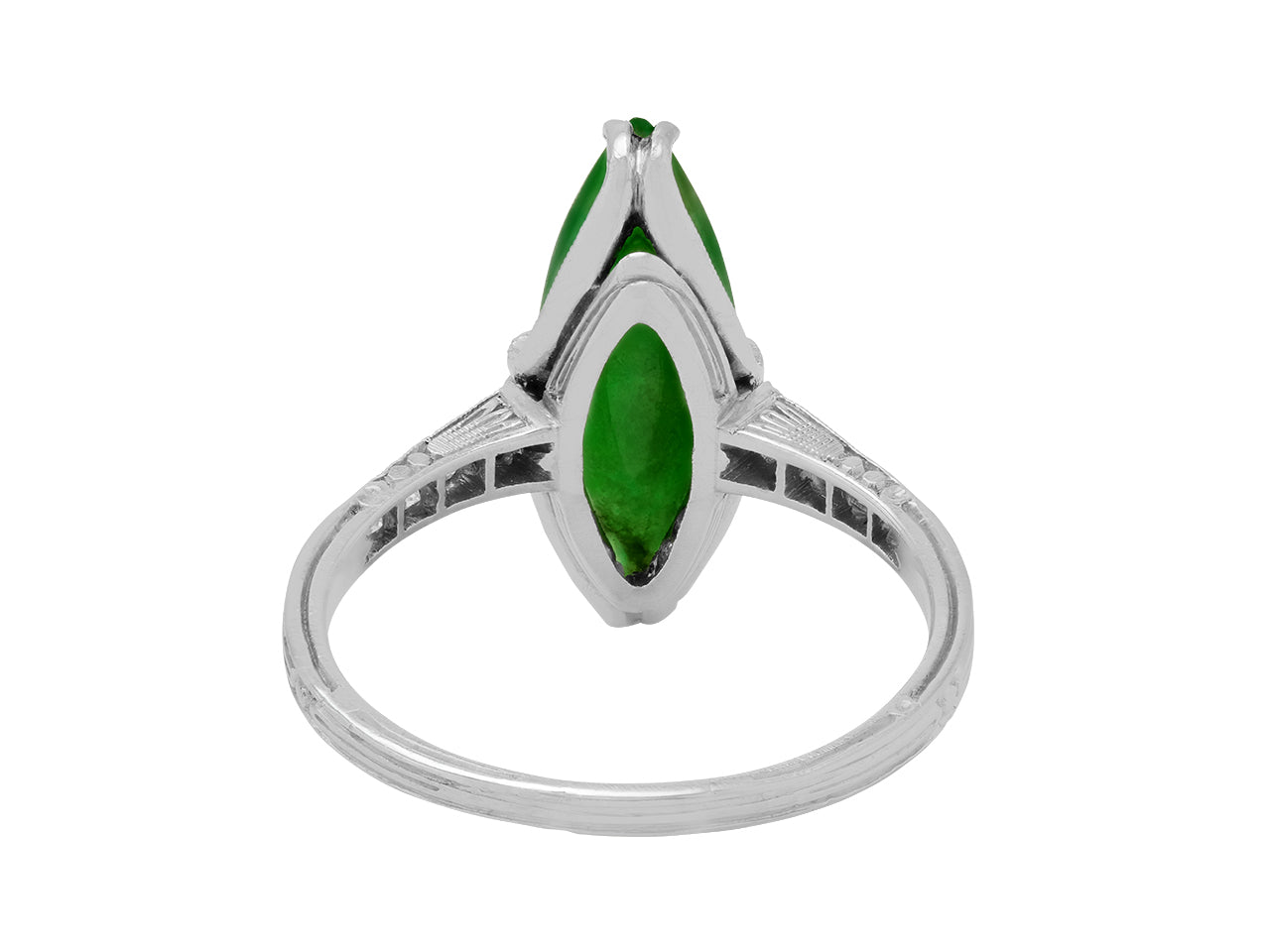 Prong-set with a navette-shaped green jade measuring 17.8 mm by 11.9 mm, with millegrain set diamond shoulders, to a platinum band with etched detailing.