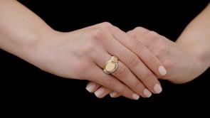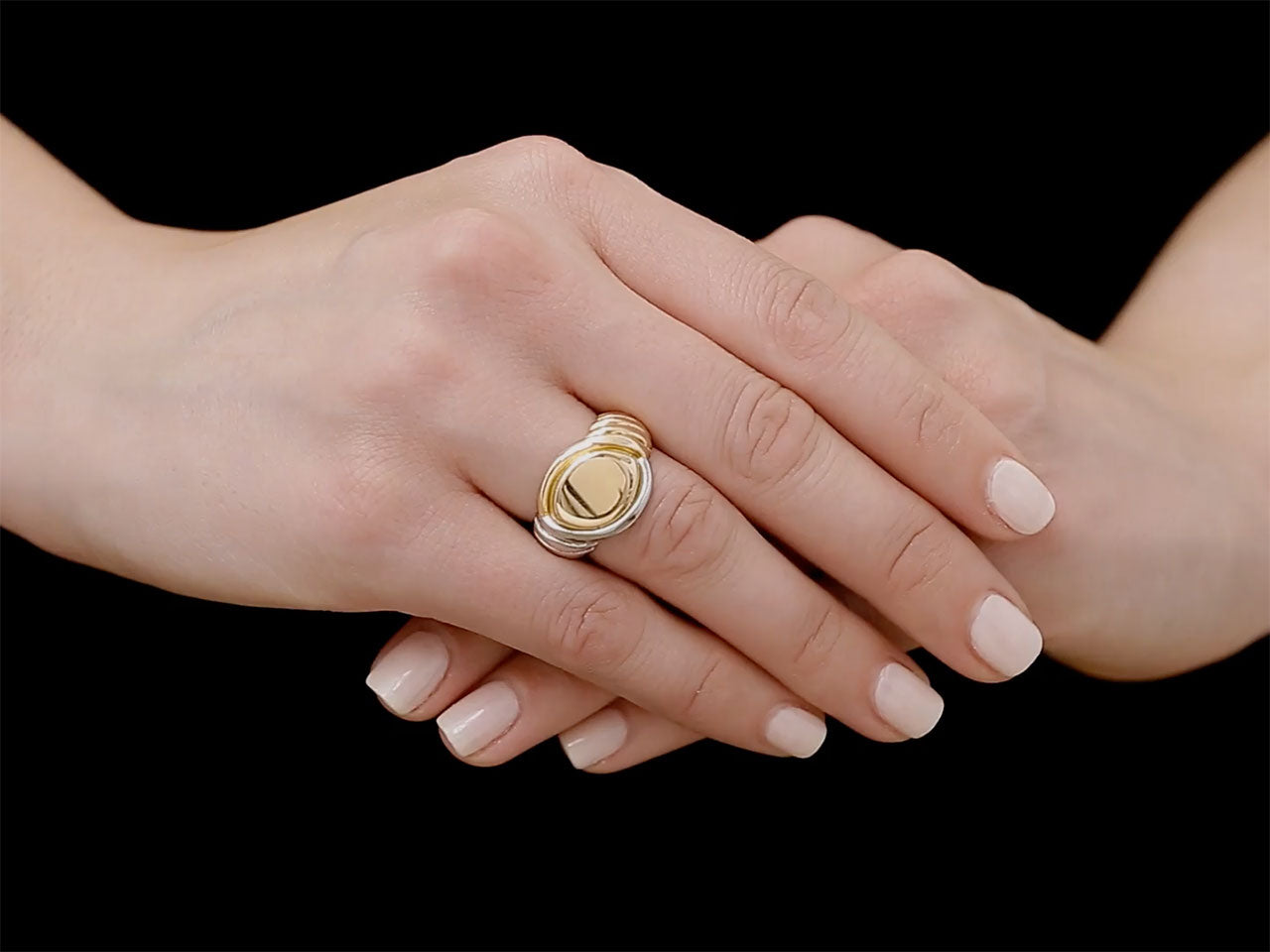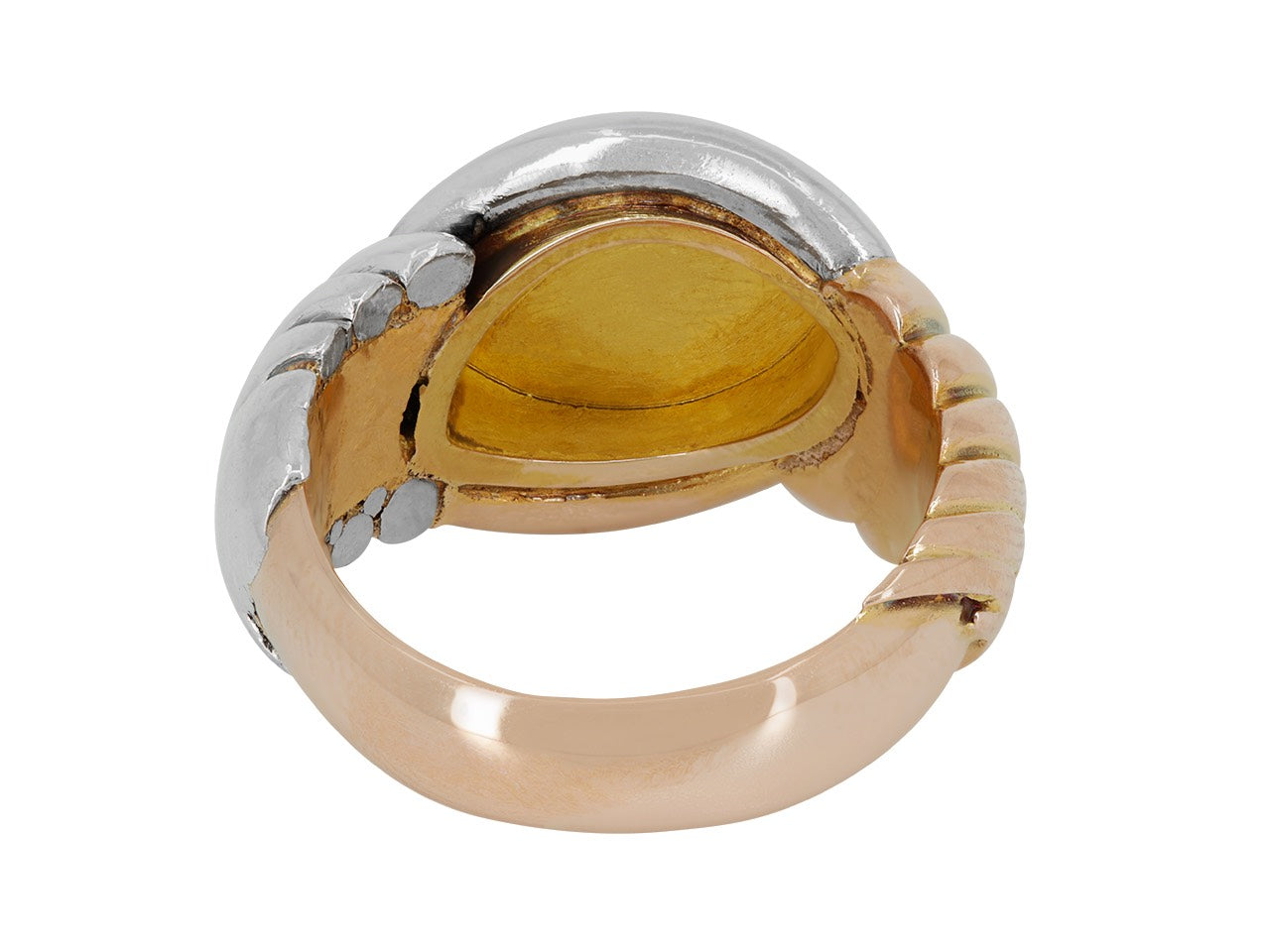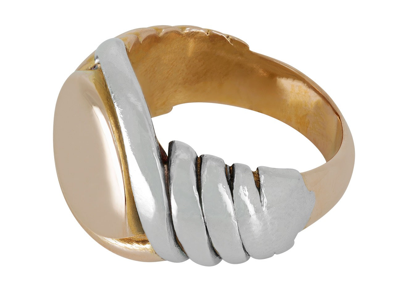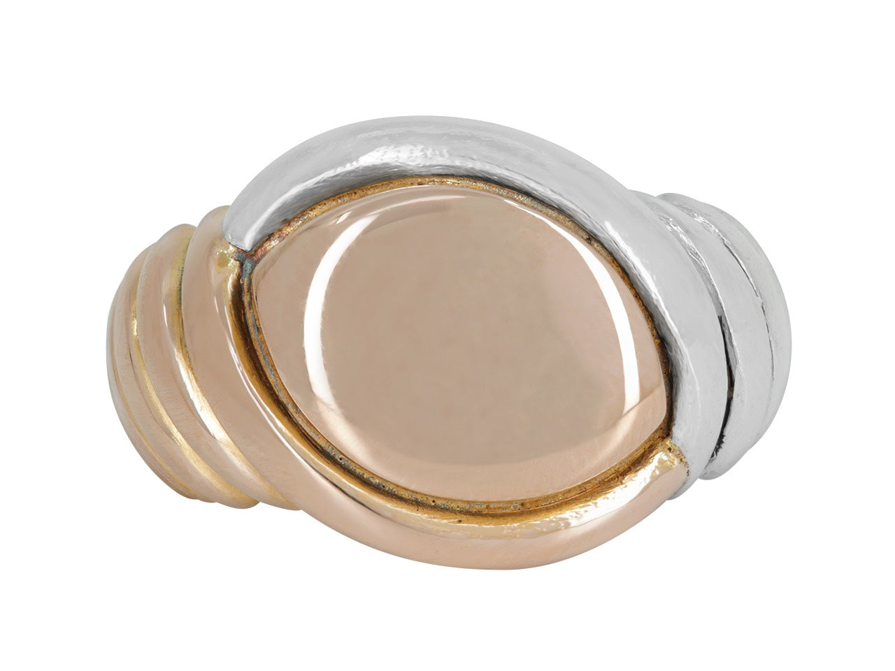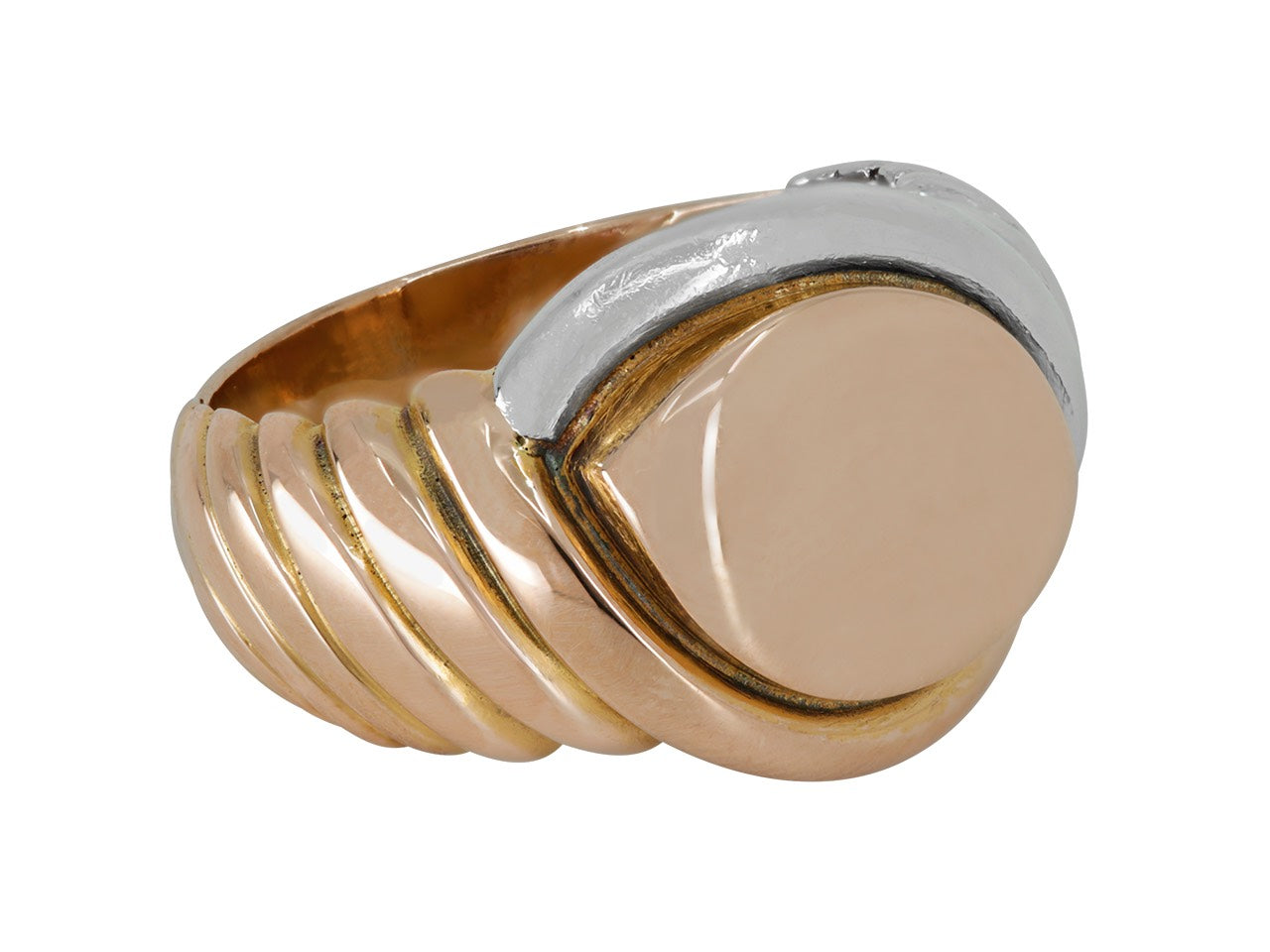 The navette-shaped signet ring top in rose gold, between fluted yellow gold and platinum shoulders.