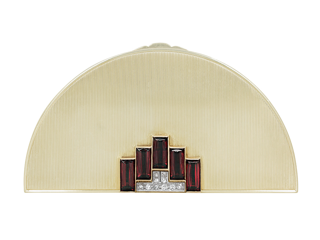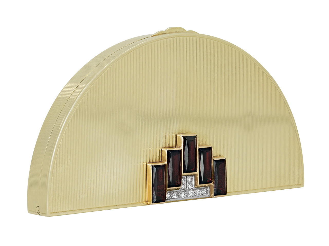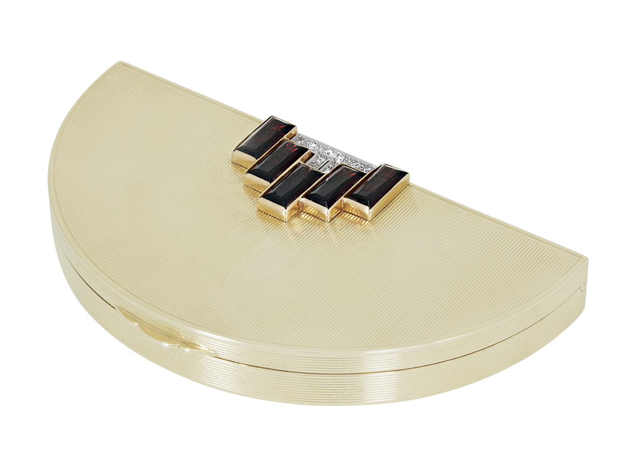 Of semi-circle outline, in fine fluted finish gold, accented by a geometric pattern set with rectangular garnets, single-cut and old-cut diamonds, the lid opening to reveal a picture frame, in 14k yellow gold. With fitted leather case.