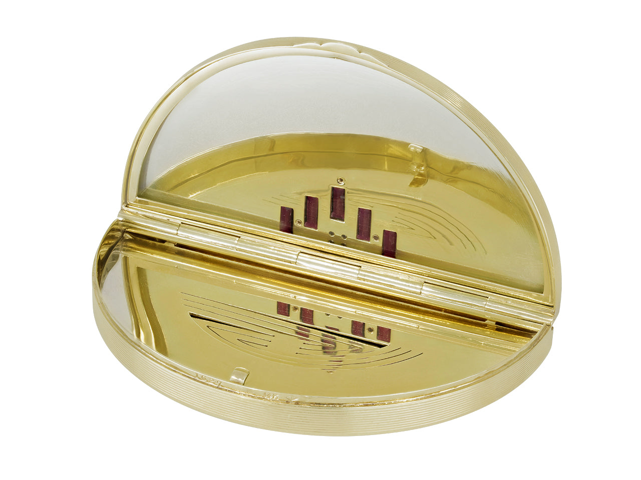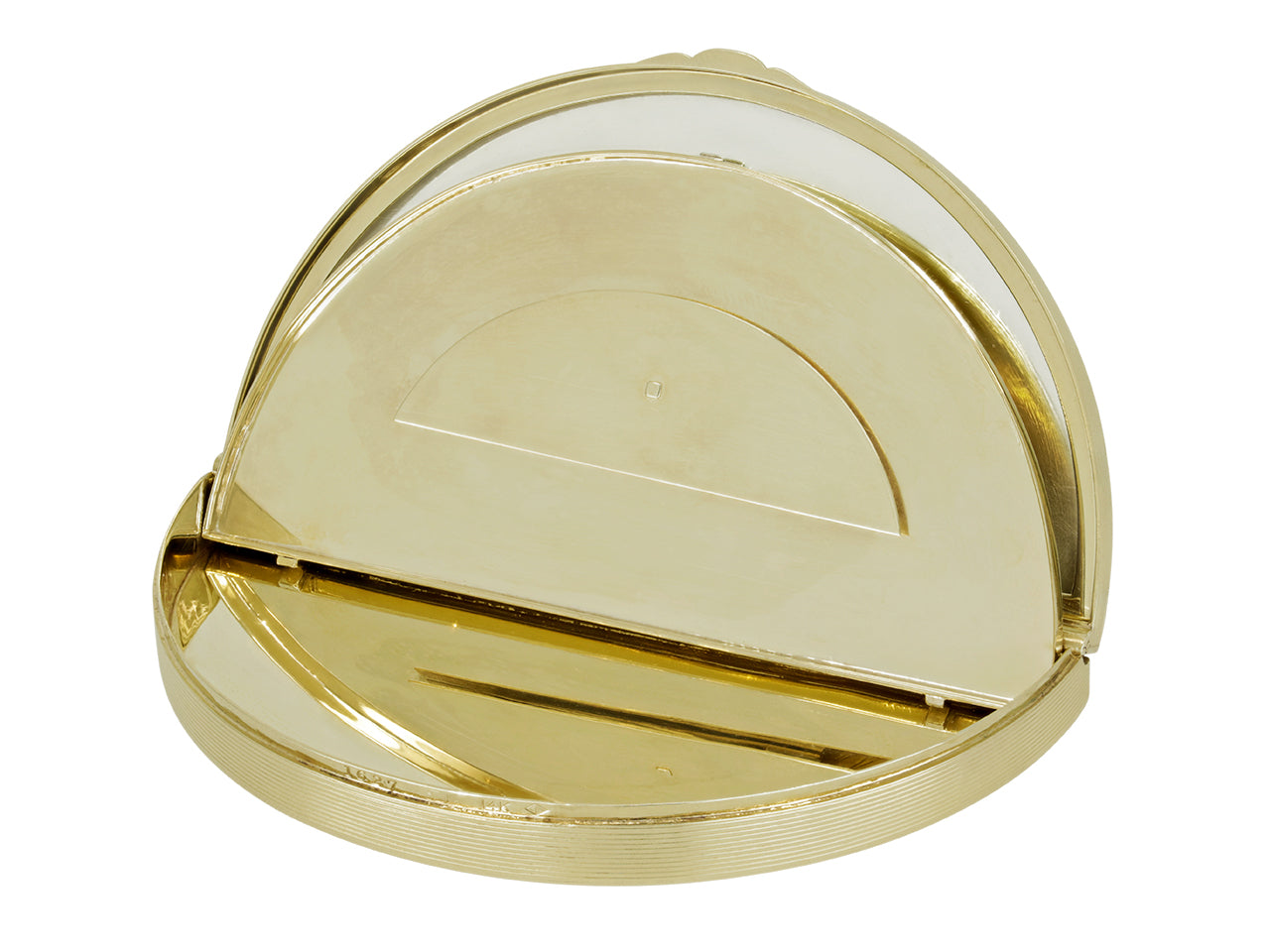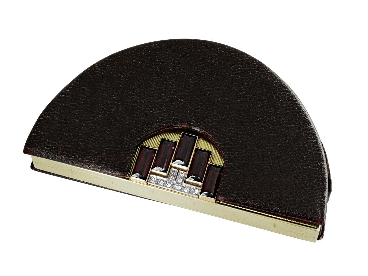Of semi-circle outline, in fine fluted finish gold, accented by a geometric pattern set with rectangular garnets, single-cut and old-cut diamonds, the lid opening to reveal a picture frame, in 14k yellow gold. With fitted leather case.