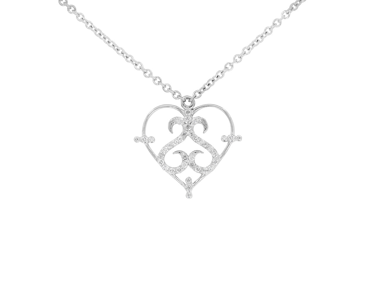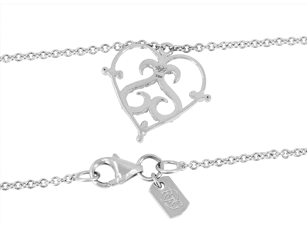The open heart pendant set with a row of round diamonds, each cardinal point set with a diamond trio, the center accented with diamond set scroll motifs, to a fine link chain, all in 18k white gold. Signed RFG for Rhonda Faber Green.
