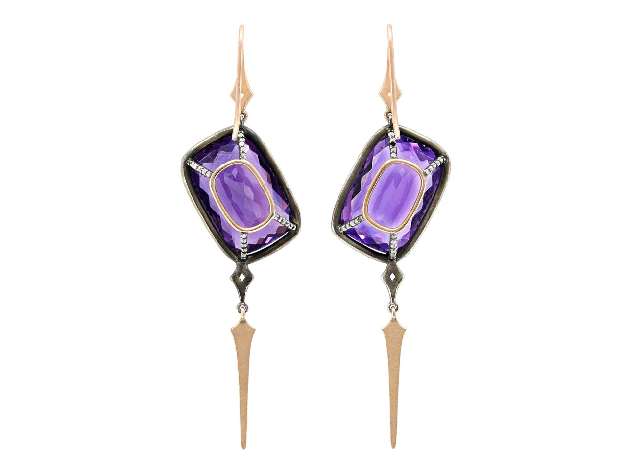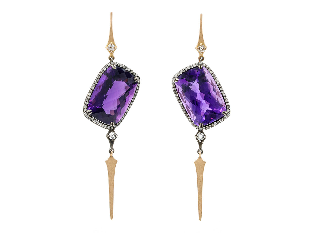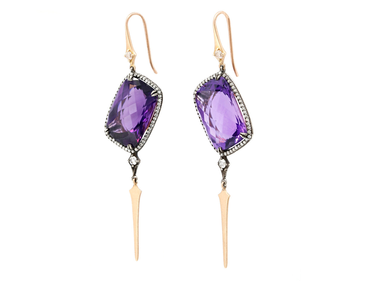 The "Crooked Queen" from Parulina's Sovereign Collection, each with a large, fancy-cut amethyst with diamond border, in silver, suspending a gold dagger motif, from the rose-cut diamond accented gold hook, in 18k. The reverse gallery is also set with diamonds.