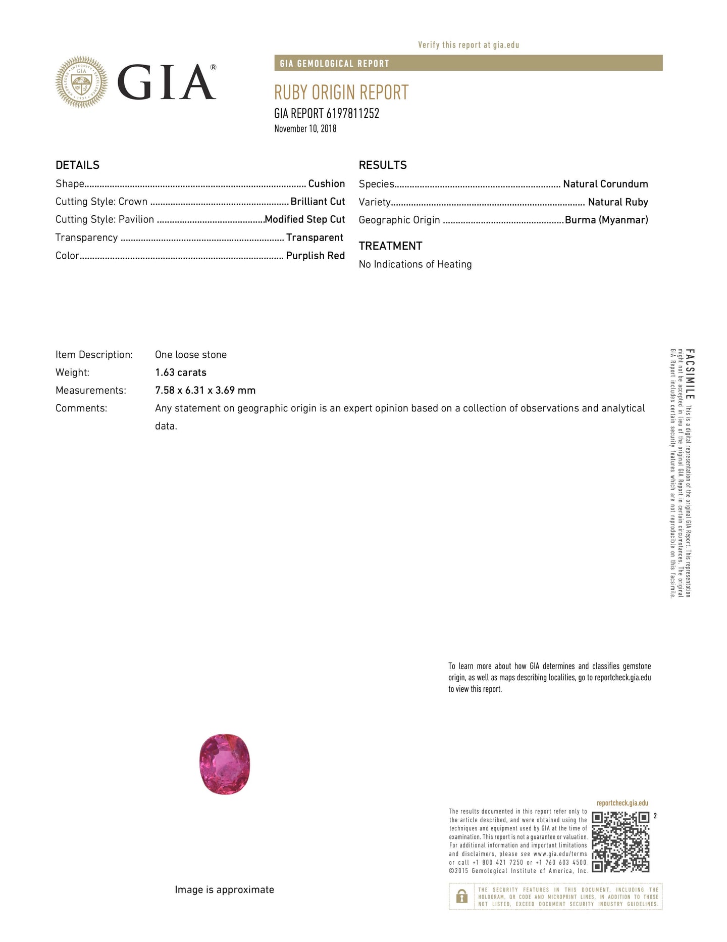 - Gem Stone: Center Ruby 1.63 carats Cushion cut/No Heat Burma; GIA Report No. 6197811252