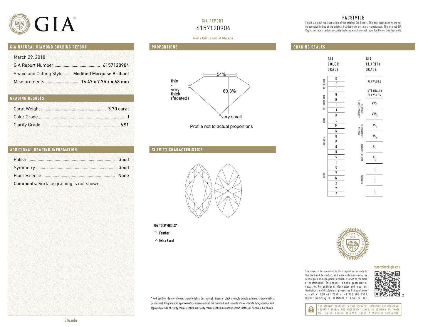 - Gem Stone: Diamond 3.70 carats Marquise cut I/VS-1 GIA 6157120904
