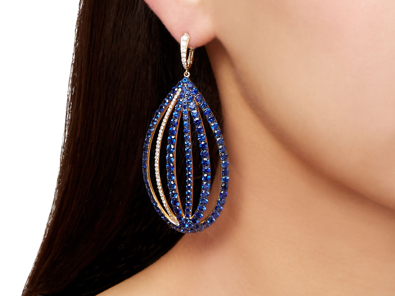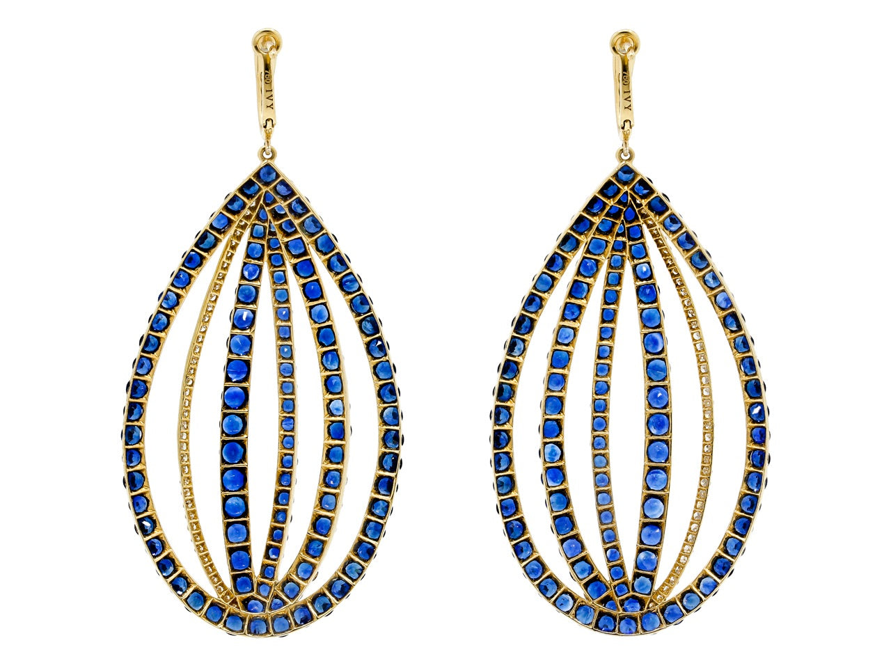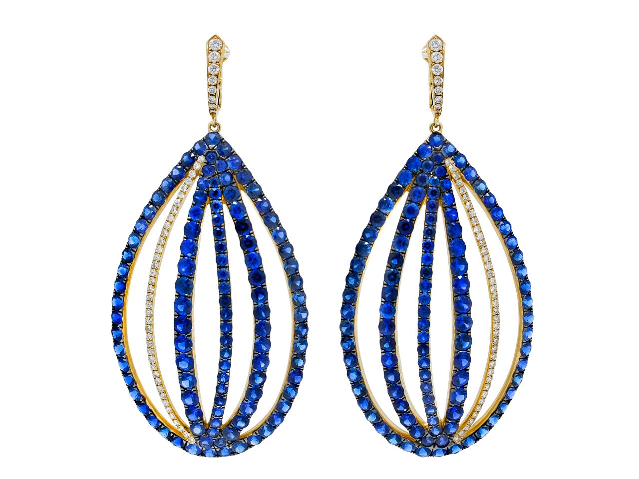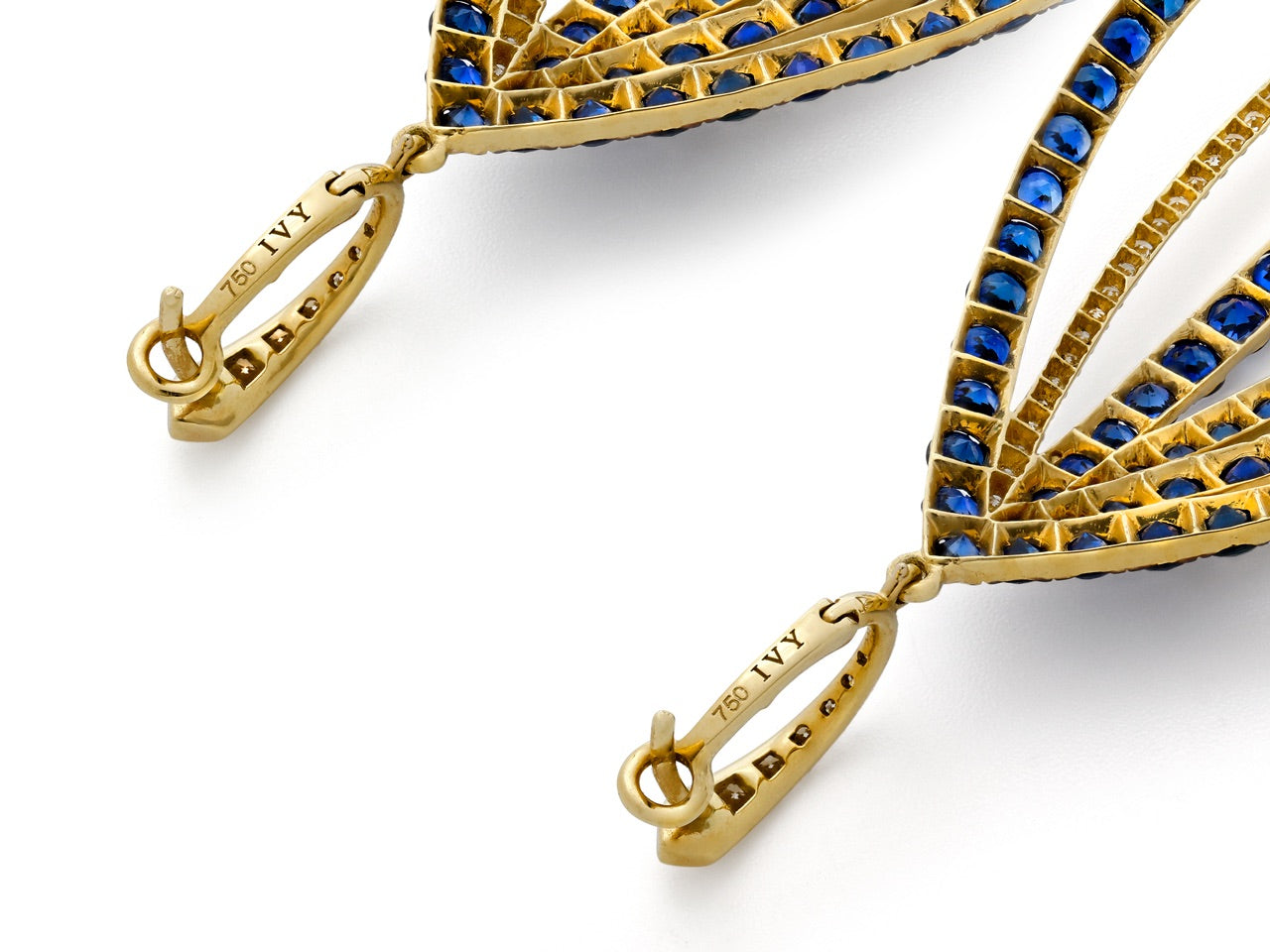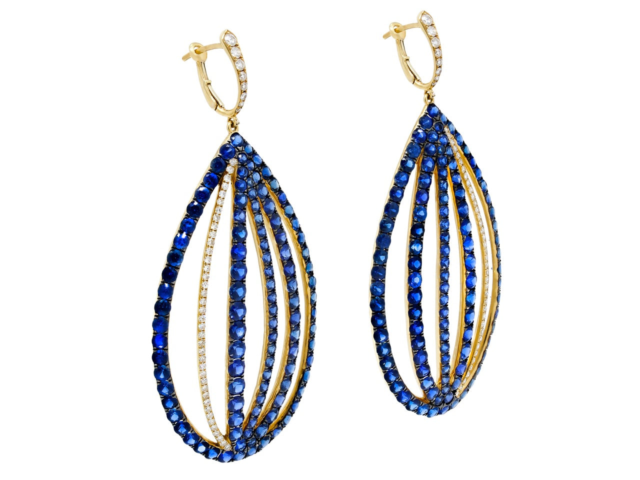 Each tear shaped drop comprising five convex bright blue sapphire lines, each of different sizes, accented by a single diamond line, suspended from diamond-set half hoops, in 18K Gold. Signed Ivy.