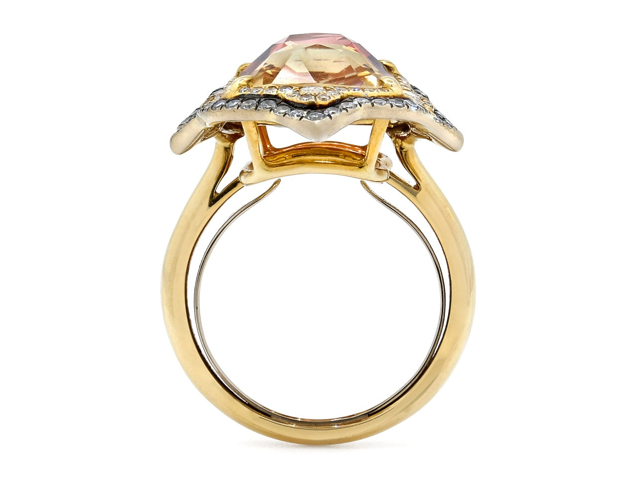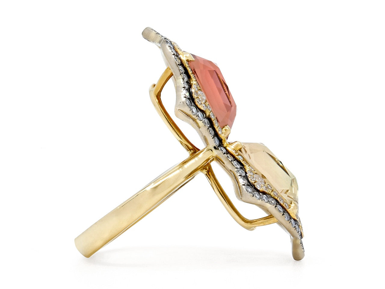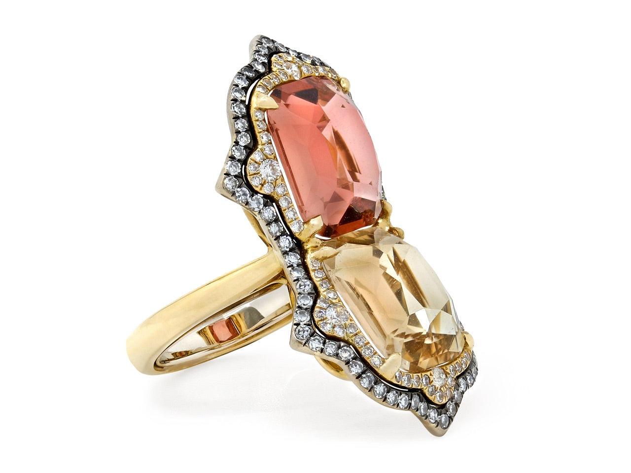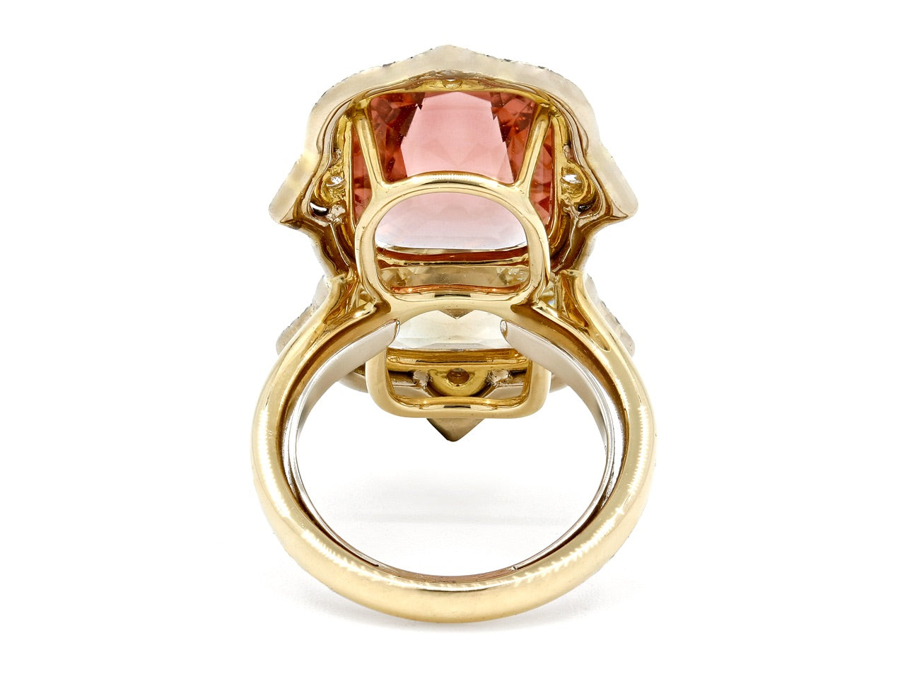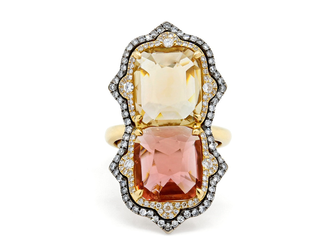 The ring top set with a yellow tourmaline, weighing 4.14 carats, and an orange tourmaline, weighing 3.93 carats, bordered by diamonds set in yellow gold, within a second diamond border in white gold, to the yellow gold band, all in 18k. Chip on the pink tourmaline.