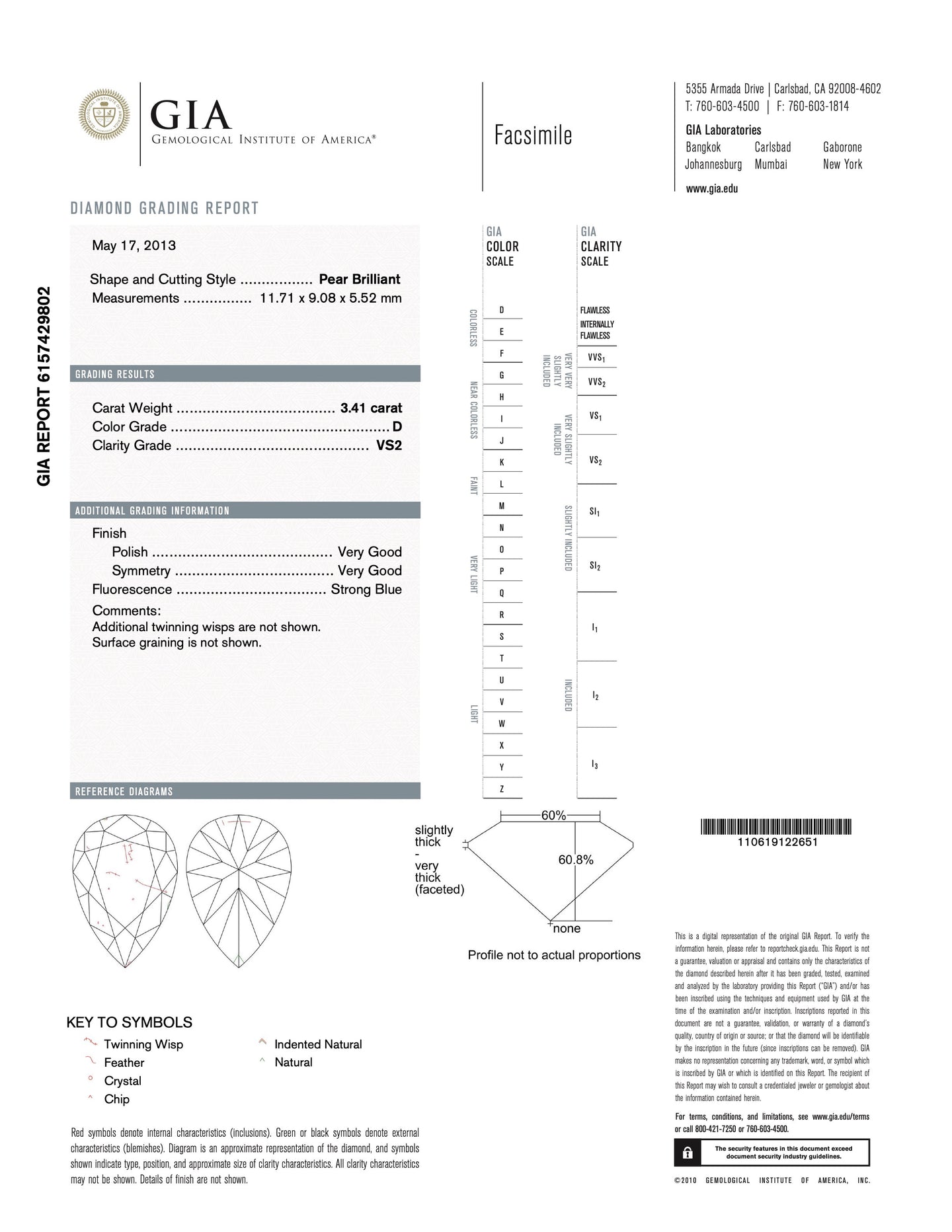 - Gem Stone: Diamond 3.41 carats Pear cut D/VS-2 GIA Report No. 6157429802