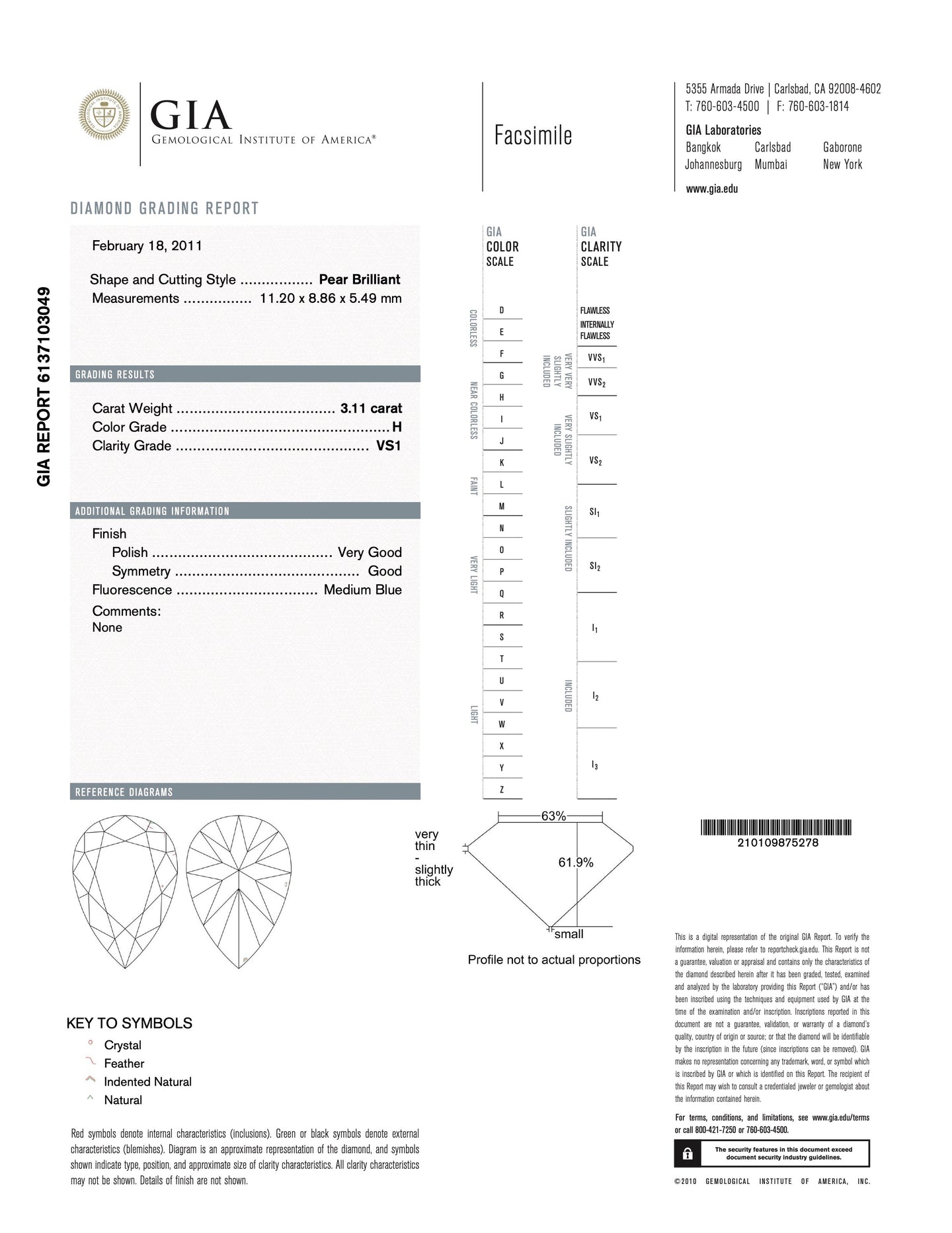 - Gem Stone: Diamond 3.11 carats Pear cut H/VS-1 GIA Report No. 6137103049
