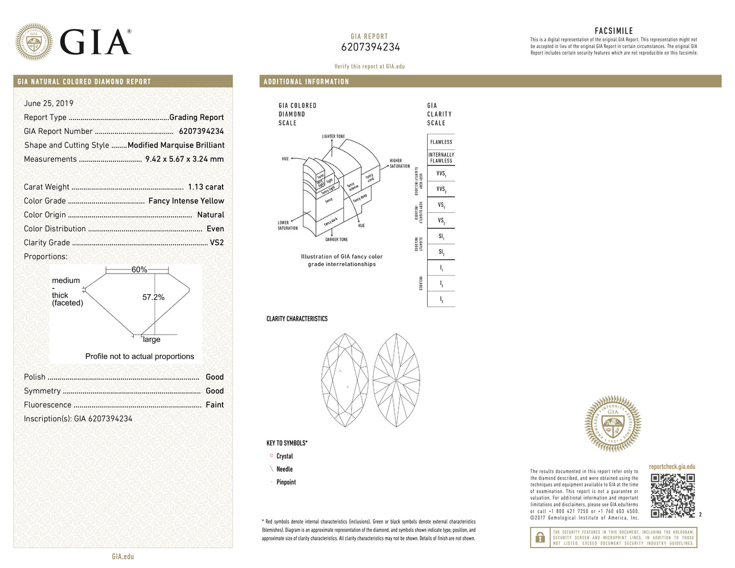 - Gem Stone: Yellow Diamond 1.13 carats Marquise cut Fancy Intense Yellow/VS-2 GIA 6207394234