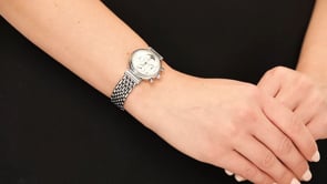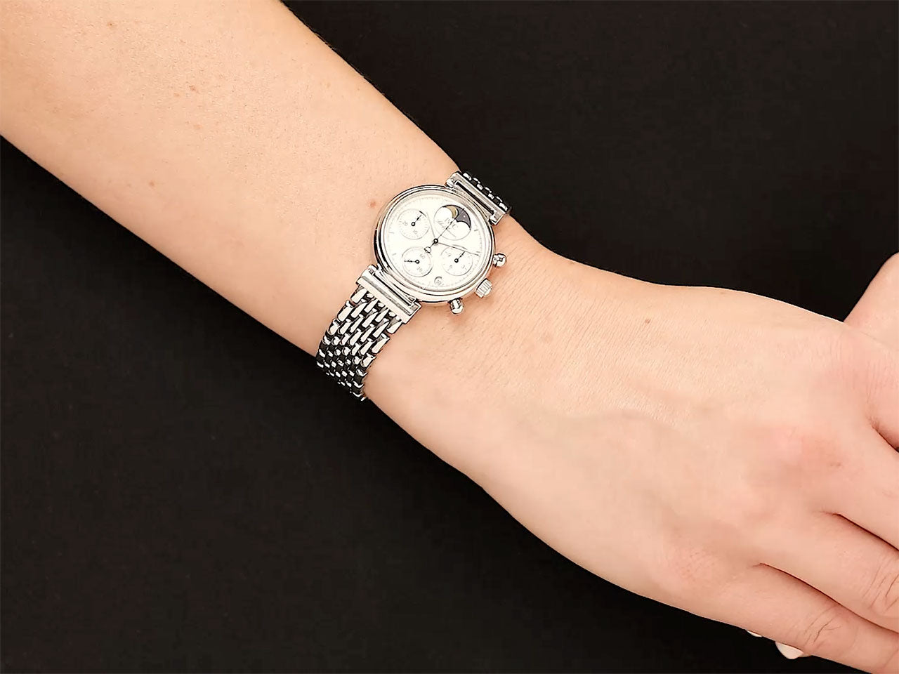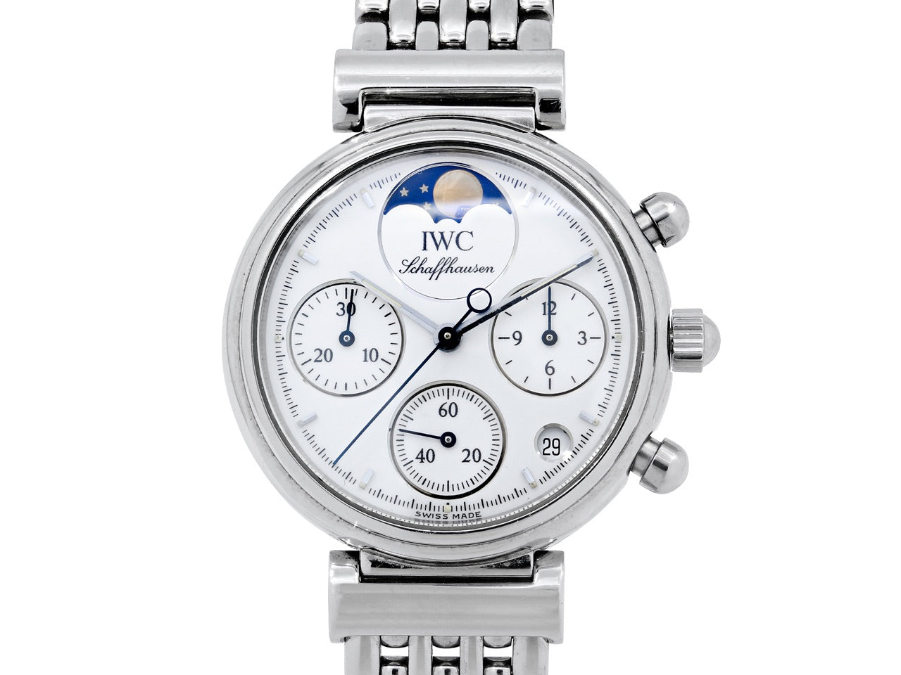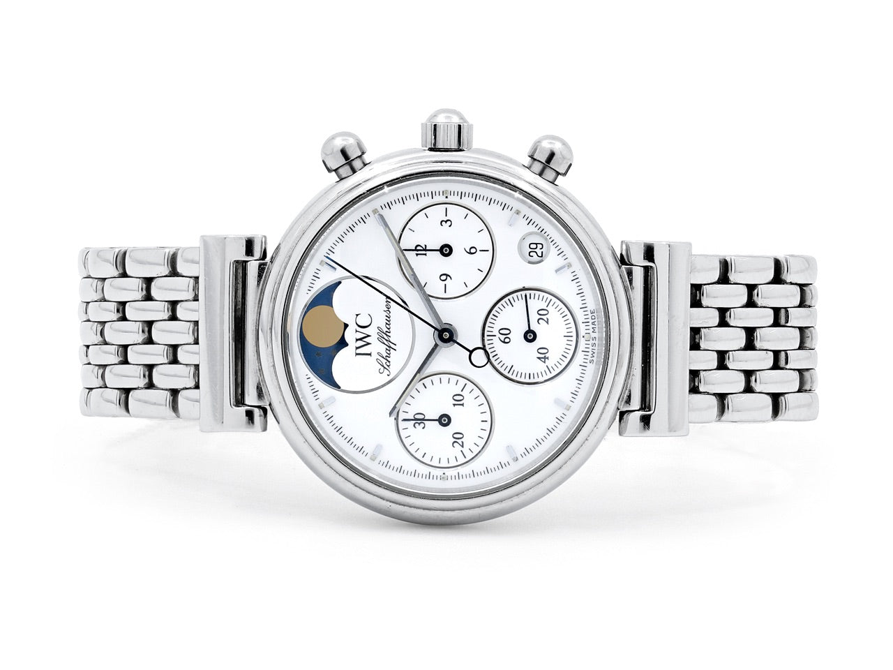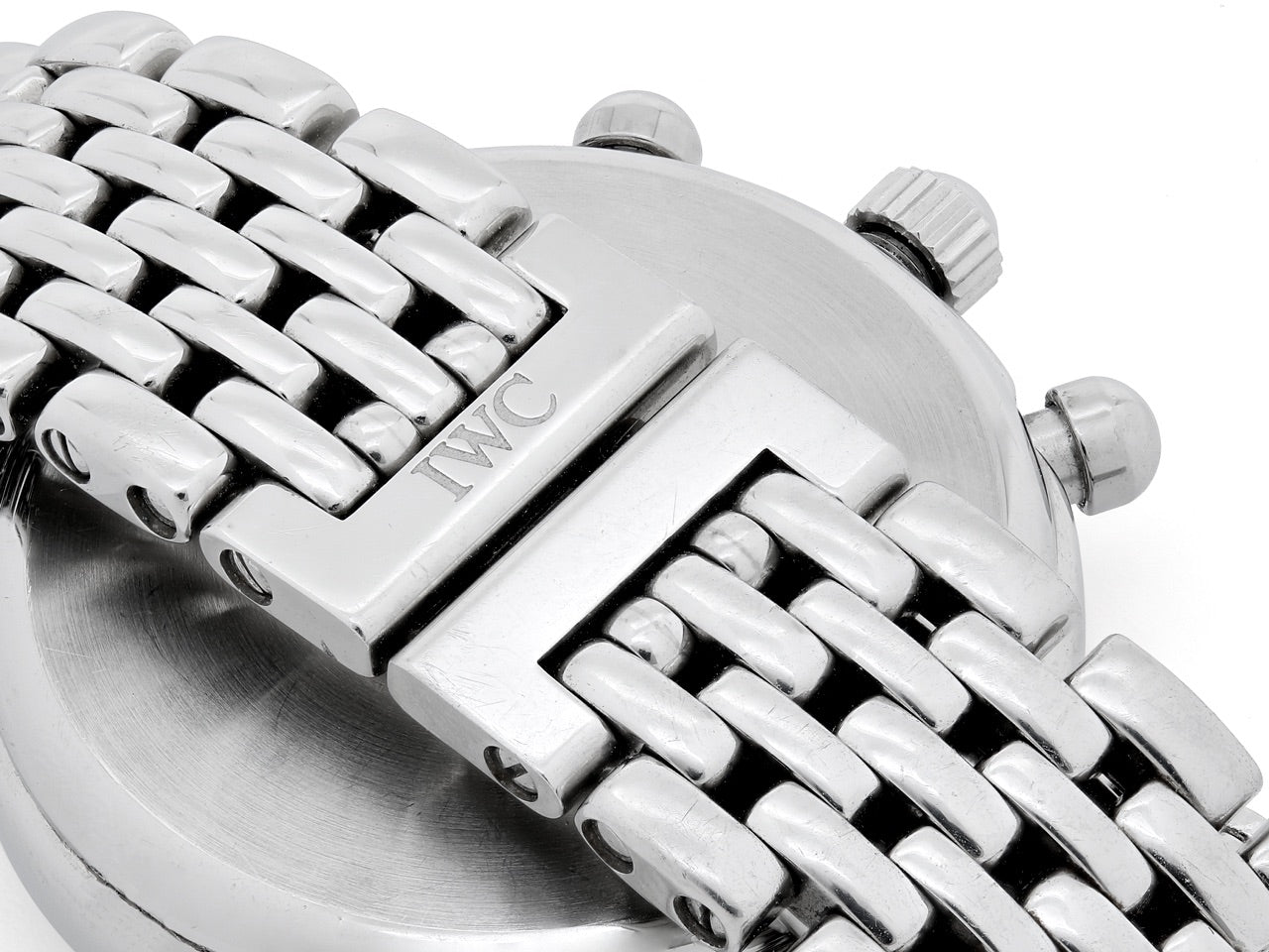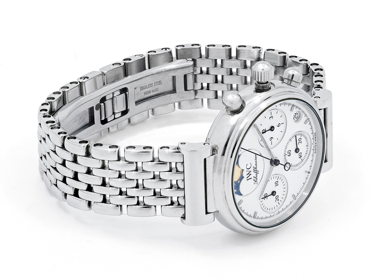 Round white dial with baton hour markings, moon phase, date, subseconds and chronograph aperture, round steel case, seven row link bracelet. Dial and bracelet signed IWC.