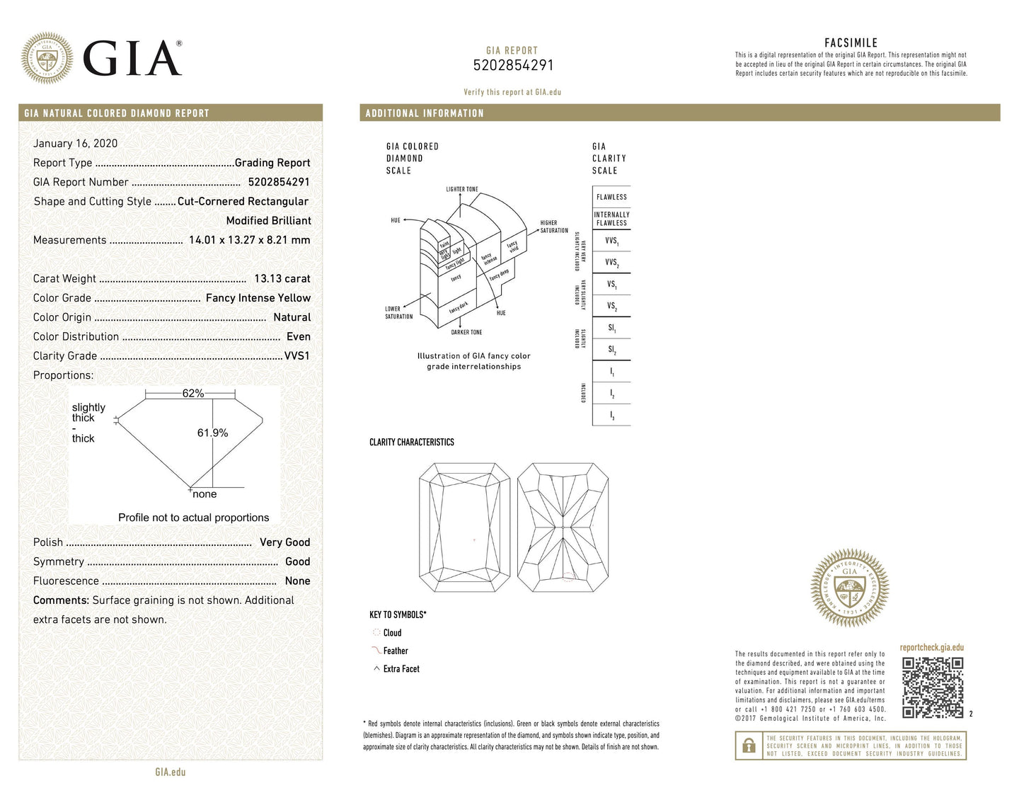 Accompanied by a GIA (Gemological Institute of America) report stating that the radiant-cut diamond is Fancy Intense Yellow in color, VVS-1 clarity.The color grade of white diamonds is determined by absence of, or the amount of, yellow tint or other modifying colors. The highest grade white diamonds are crystal-clear, pure white stones. The color grade is measured on an alphabetical chart starting with "D" (colorless) and running through "Z" (light color). As the color grade moves down the alphabet, the amount of color in the diamond becomes more obvious and the value of the diamond decreases. However, once the color tint of a diamond reaches a certain level of saturation, the appearance begins to improve, becoming more attractive, and the value increases.